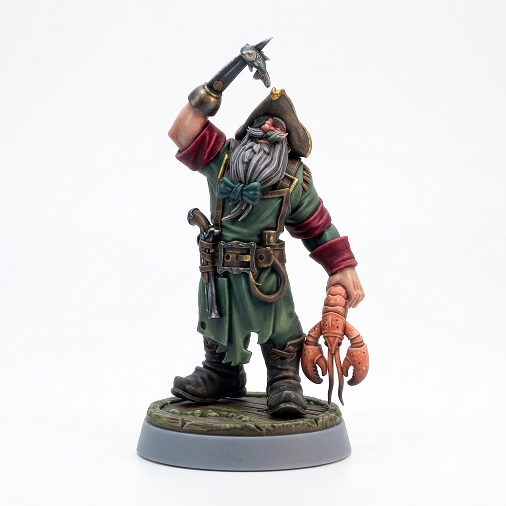Add flavor to your tabletop adventures with this fantastic Pirate Cooker miniature from CastnPlay. This detailed sculpt captures a weathered pirate holding a lobster and a clever, clearly ready to prepare a feast (or a fight!). It's a perfect character model to populate your pirate ship, bustling tavern, or exotic island encounter, bringing a unique touch of personality to your narrative. The sculpt quality is outstanding, capturing the texture of his clothes, beard, and the sea creatures he carries.