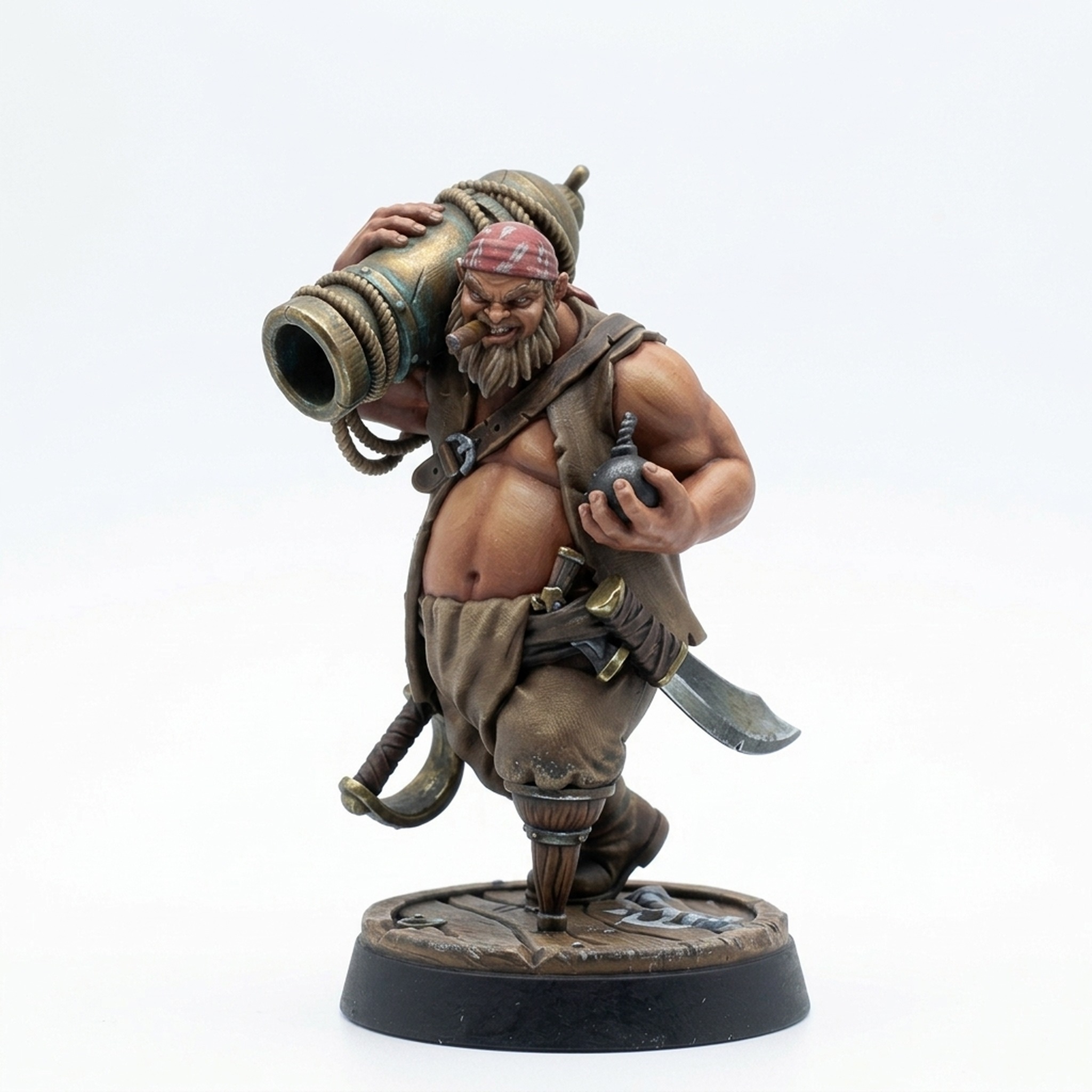 Painters will appreciate the crisp details, from the texture of the ropes on the cannon to the musculature, facial expression, and torn clothing, offering a satisfying canvas for showcasing your skills. The character exudes a mix of ruggedness and explosive intent that will stand out on any gaming mat. This model comes with a custom sculpted base that fits his peg leg perfectly, ensuring he's ready for action right out of the box. Whether you need an elite heavy weapon trooper for a skirmish wargame or a memorable character for your D&D party's ship, the Pirate Gunner brings firepower and personality in spades.