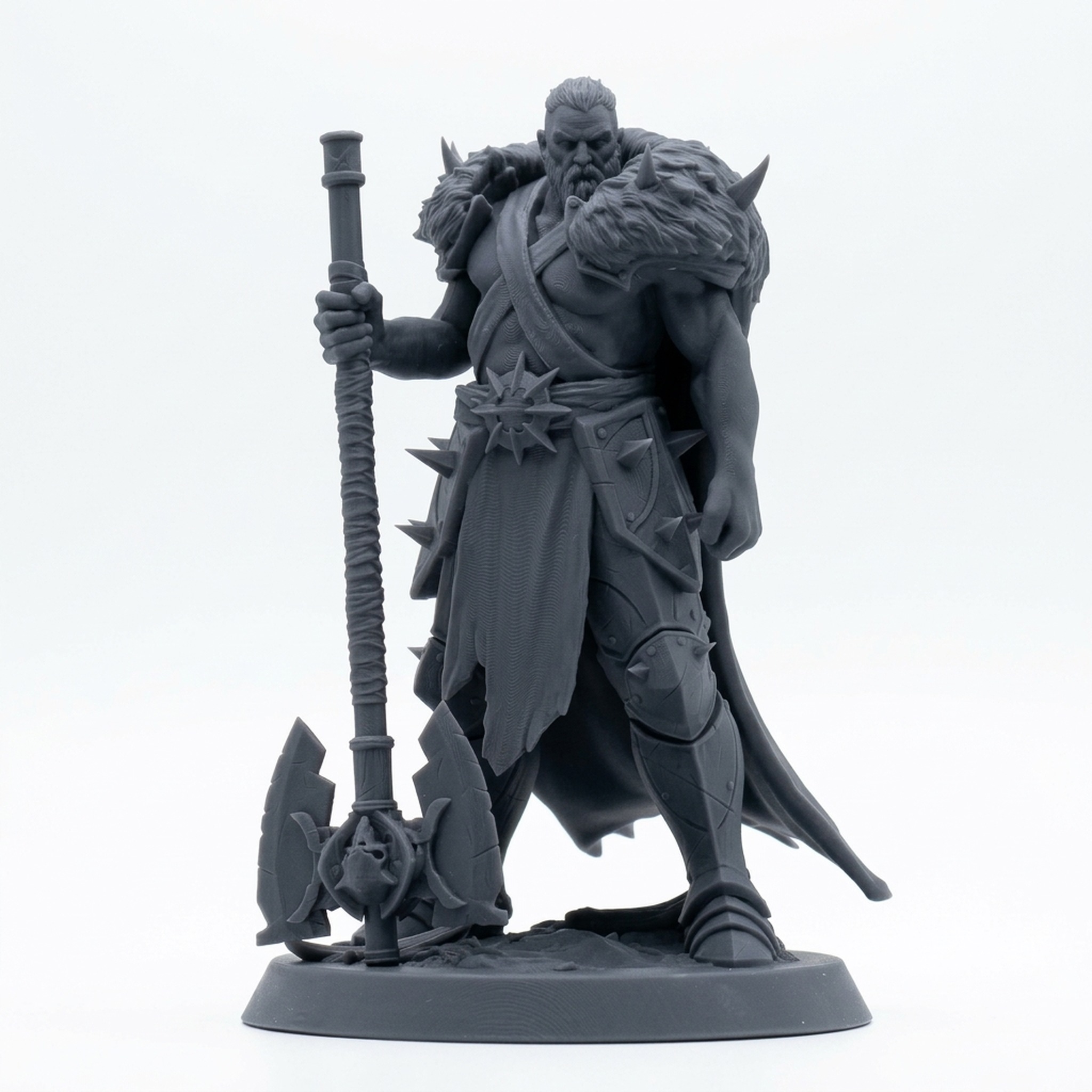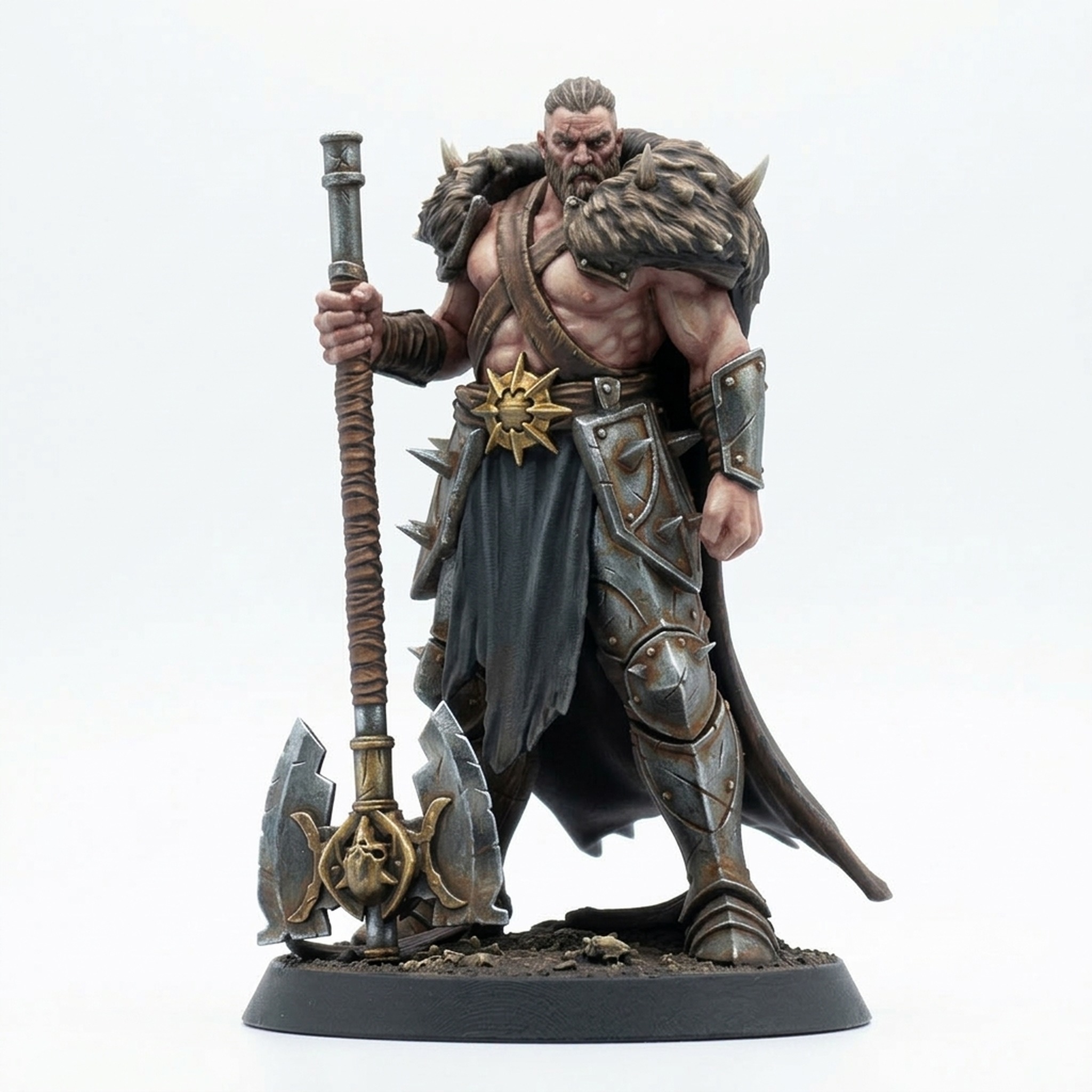 Unleash the primal fury of the UnchainedSoldier Ranger with this formidable miniature in a dominating bigaxe pose. This high-detail sculpt from Rescale Miniatures features a rugged, bearded warrior clad in spiked heavy armor, leather pauldrons, and a thick fur mantle. Holding his massive, skull-adorned double-headed battle axe firmly on the ground, he exudes raw strength and determination, ready for any challenge your tabletop campaign throws at him.