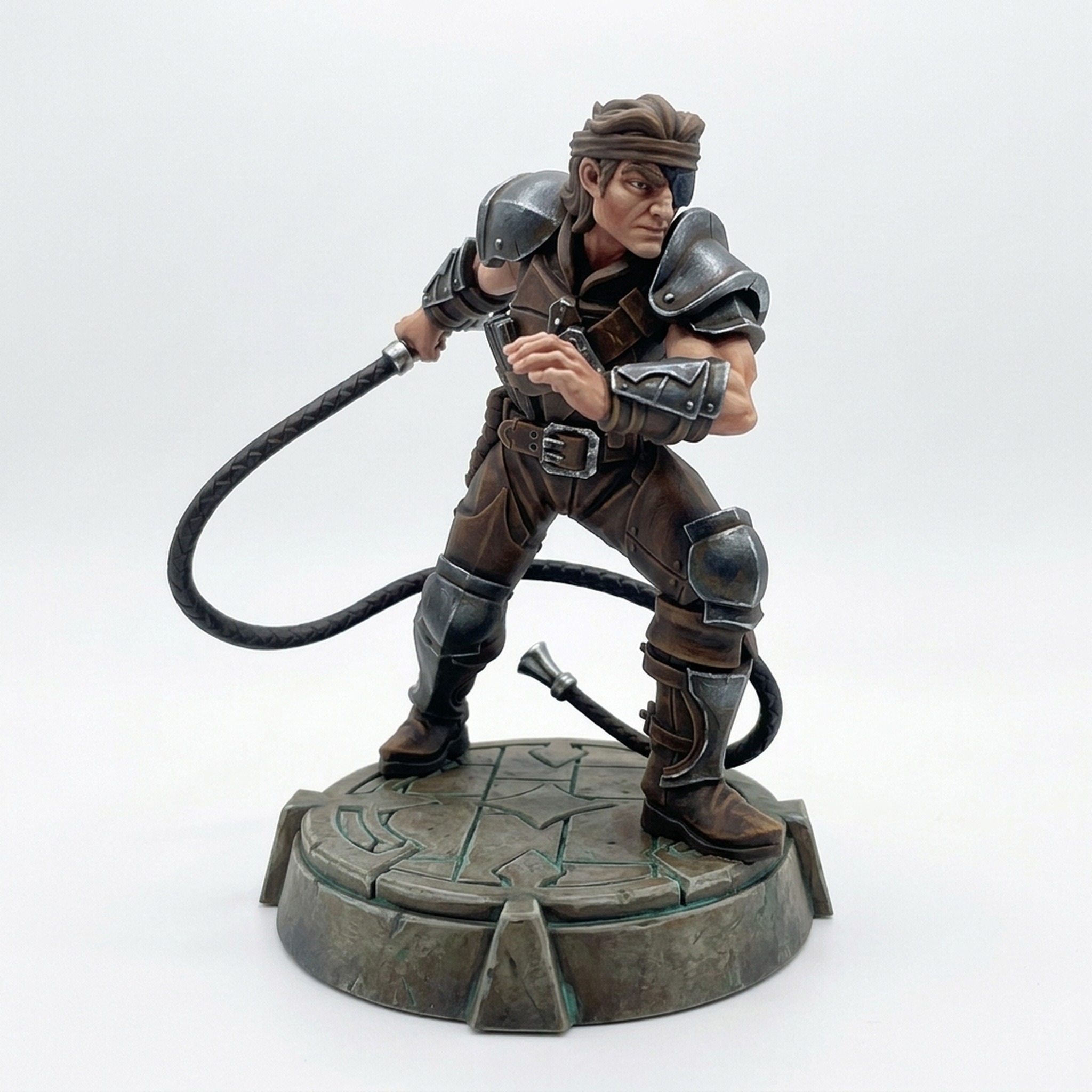Unleash the wrath of a seasoned veteran with the Rein Hagen miniature from CastnPlay's 'Vampires' collection. This highly detailed sculpt perfectly captures the grizzled determination of a master vampire hunter. Rein Hagen stands on an ornate, patterned base, ready for battle with his leather armor, cross-chest bandolier, and signature weapon—a long leather whip. His distinct eyepatch and flowing hair add layers of character, telling the story of countess battles fought against the undead. The dynamic pose and crisp details of his gear make this a perfect centerpiece for any tabletop encounter or painting project.