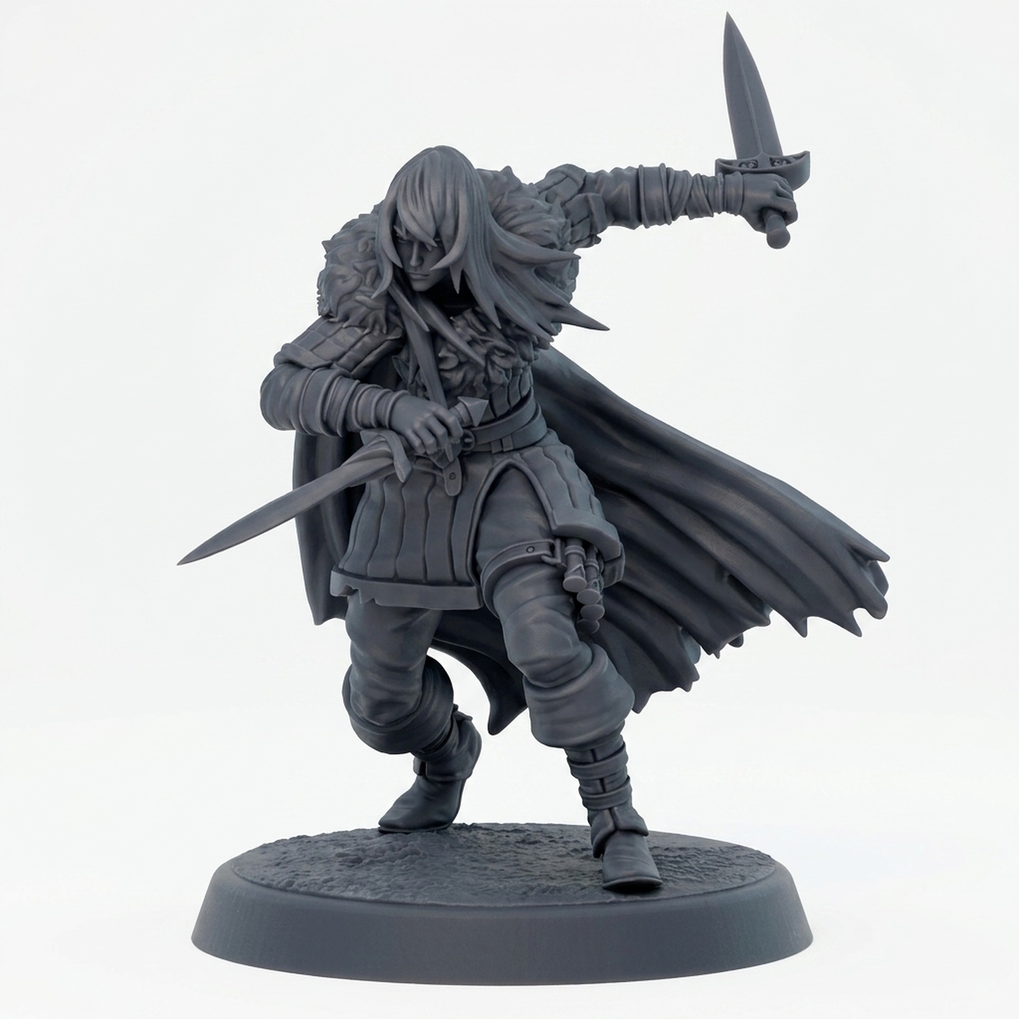 Whether you see her as an elusive rogue, a determined ranger on a fresh trail, or a deadly bounty hunter, this highly detailed miniature is a versatile addition to any fantasy RPG like Dungeons & Dragons or Pathfinder. She works perfectly as a lethal player character or a formidable NPC tracking the party. The fine details, from the texture of her gear to the intense expression beneath her long hair, are expertly designed for painting, offering a rewarding project for miniature enthusiasts looking to bring a unique character to life.