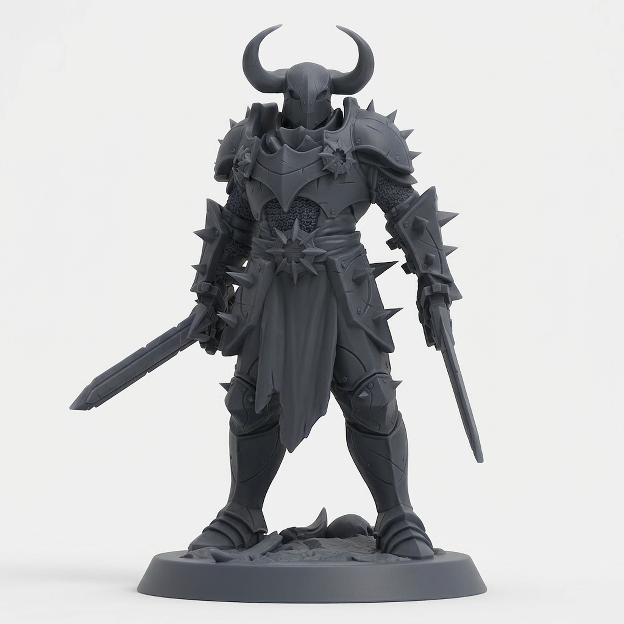 Unleash a juggernaut upon your tabletop with the formidable Swordstand Warrior from the Unchained collection by Rescale Miniatures. This heavily armored warrior is encased in a suit of dark, spike-strewn plate mail, featuring intricate filigree, chainmail underlayers, and a terrifying horned helm. Posed in a steadfast, dual-wielding stance, this miniature radiates imposing strength and battle-hardened resolve, ready to anchor any evil army, chaotic warband, or act as a powerful boss encounter.