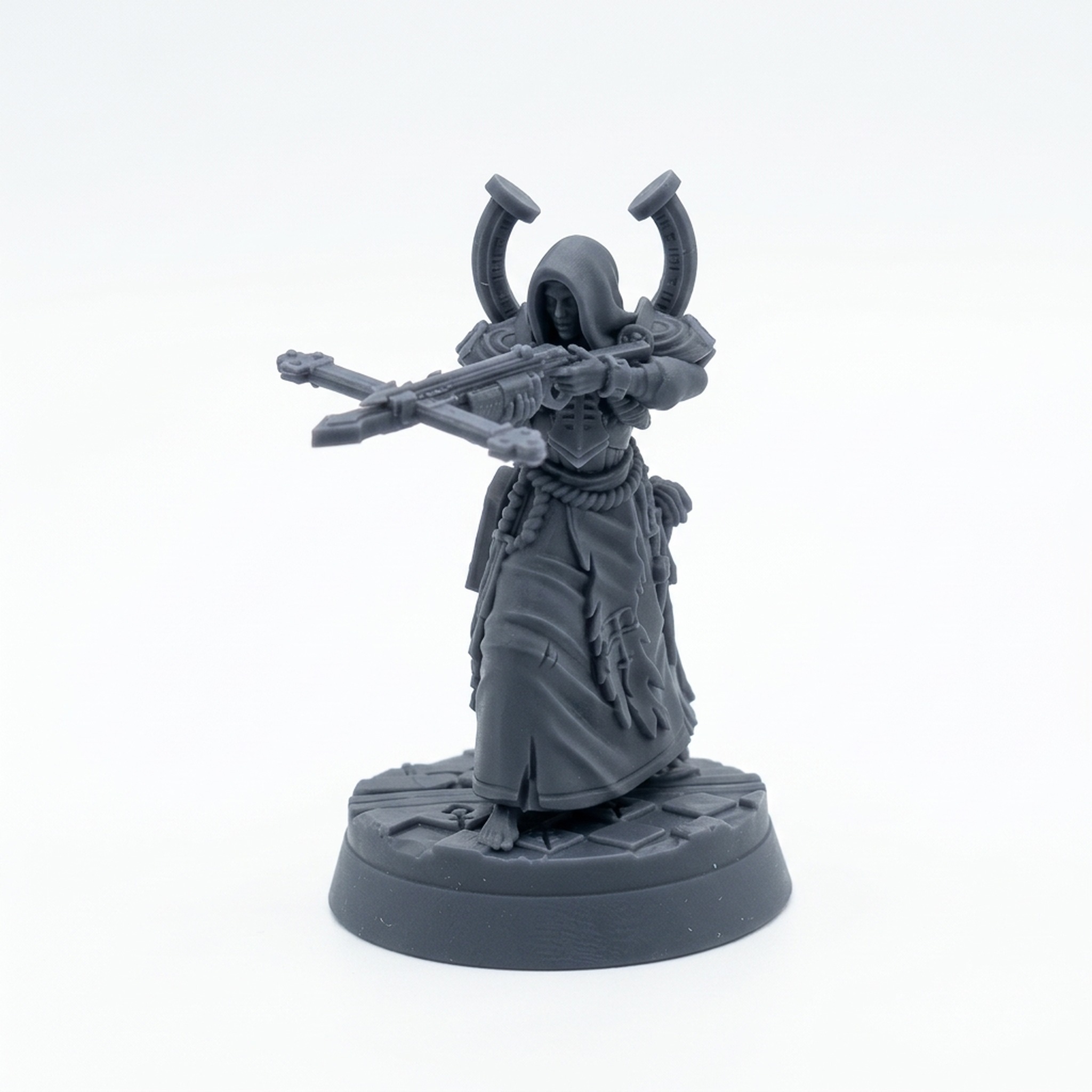 Vile Nun F stands as a haunting figure, wielding a deadly crossbow with the precision and poise of a trained zealot. This 3D-printed miniature embodies the dark aesthetic of the Church of Wrath, cloaked in robes that drape ominously around her armored form. Her hooded visage adds an air of mystery and menace, making her an imposing figure on the battlefield. The detailed ornamentation of her armor and the runic symbols on her headpiece reinforce her role as an enforcer of a grim, unholy faith. Ideal for dark fantasy or horror-themed tabletop campaigns, Vile Nun F is an excellent villainous character or elite unit in a corrupted order. Her crossbow, with intricate mechanics and jagged edges, complements the brooding design of the figure. Crafted for high-detail 3D resin printing, every fold in her robes and every symbol on her armor is sharply defined, making this model stand out in any collection. Whether serving as a high-ranking adversary or a key figure in your campaign, Vile Nun F is sure to leave an impression on both players and collectors.