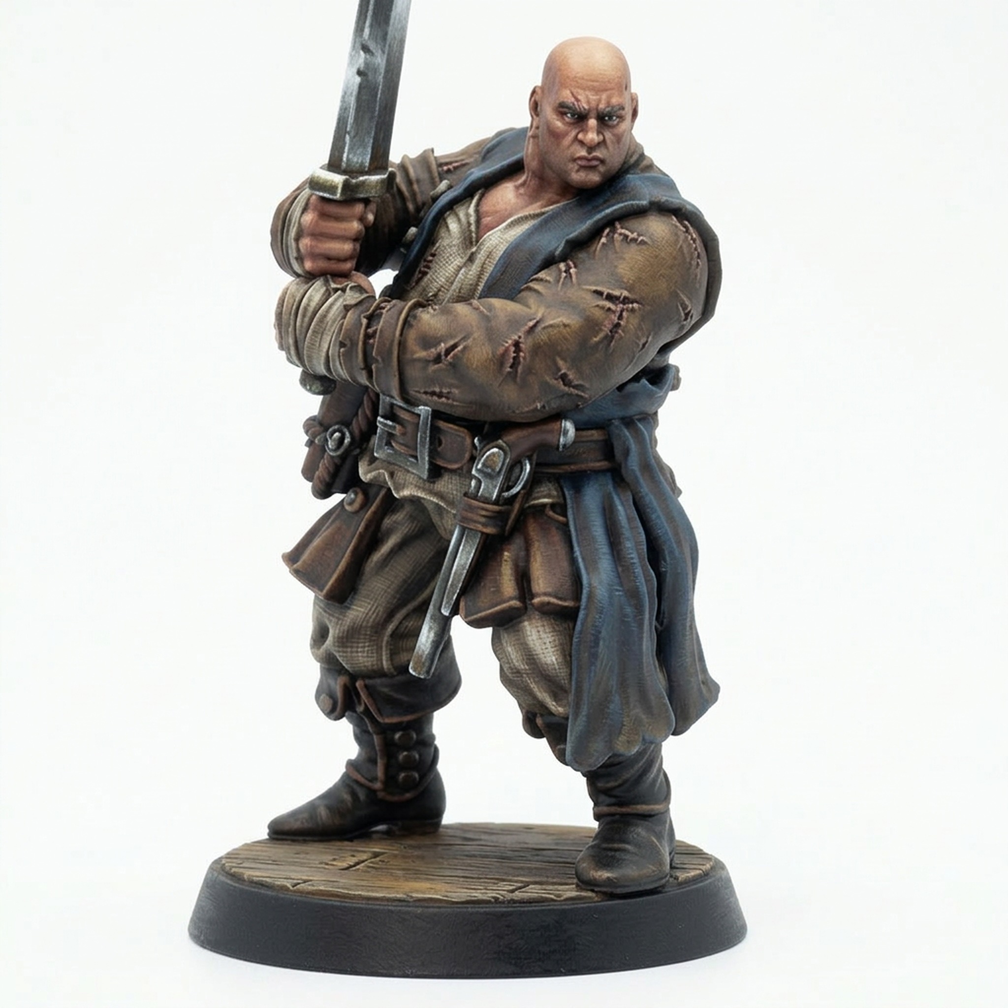 Bring a rugged veteran of the high seas to your tabletop adventures with the Wondersea Pirate 4 miniature from Mammoth Factory. This heavily scarred, muscular pirate stands ready for boarding actions and shoreline raids. Sculpted in dynamic detail, the character wears layered seafaring garb, including a heavy coat and belts, and clutches a large sword and pistol. His imposing bald appearance and intense expression capture the essence of a hardened buccaneer. Perfect as a PC, tough NPC, or member of a pirate gang.