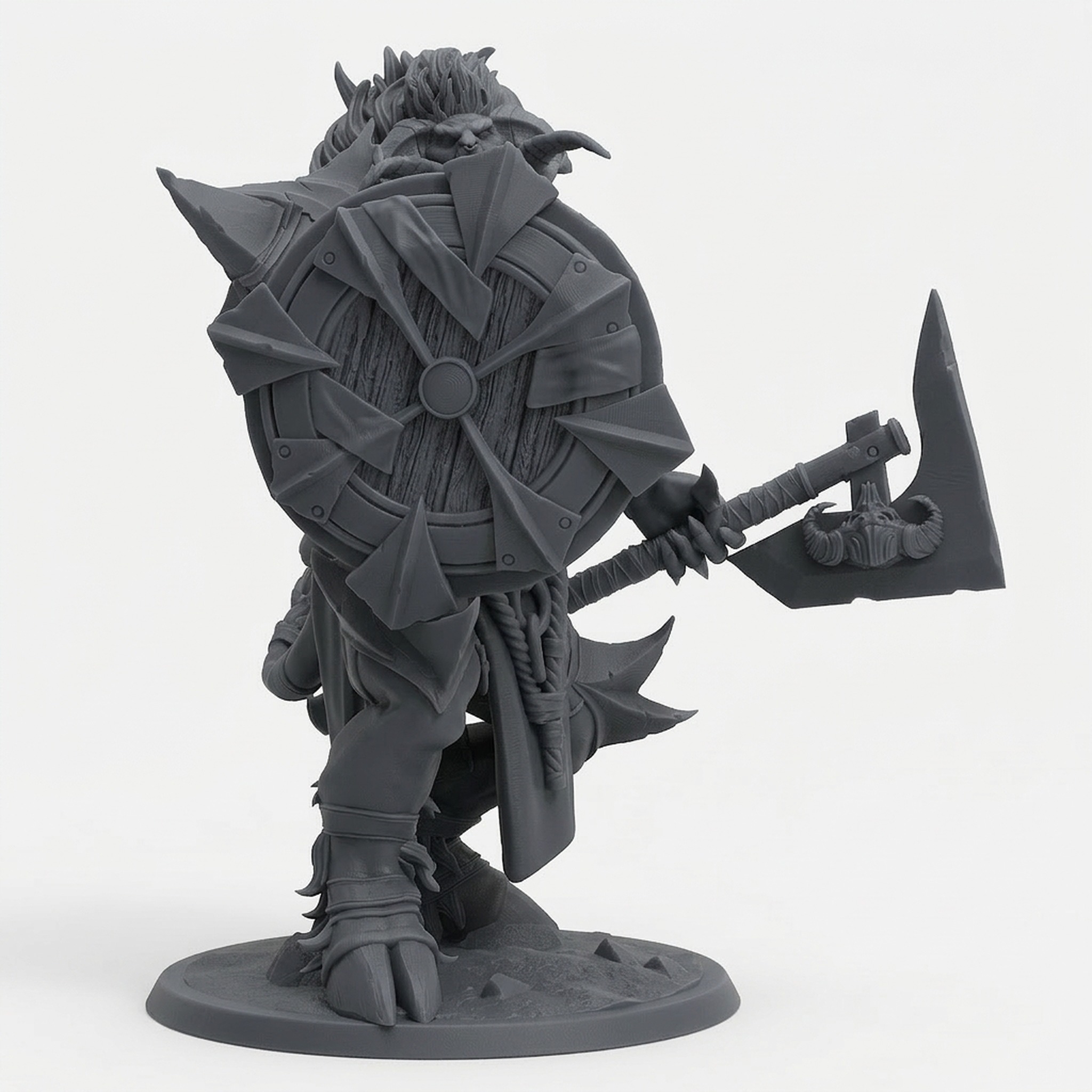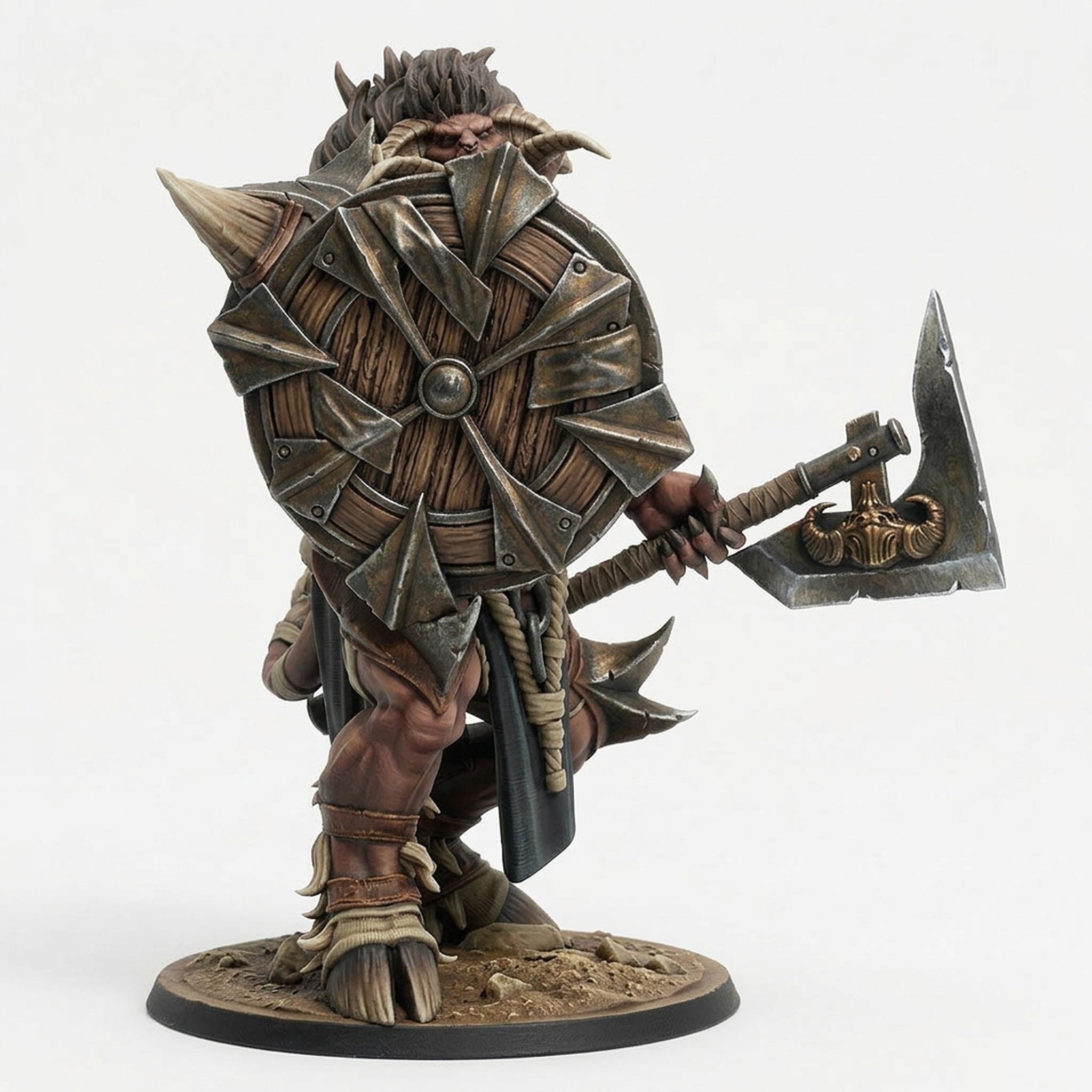 Clad in minimal but brutal armor, his physique is fully on display—thickly muscled and covered in battle scars. In one hand, he wields a formidable axe adorned with a snarling beast’s visage, while in the other, a heavy shield carved with intricate, war-torn patterns rests firmly, ready to absorb the force of any charge. His horns curve upward with a menacing grace, while his wild mane flows behind him like a warrior-king of the battlefield.