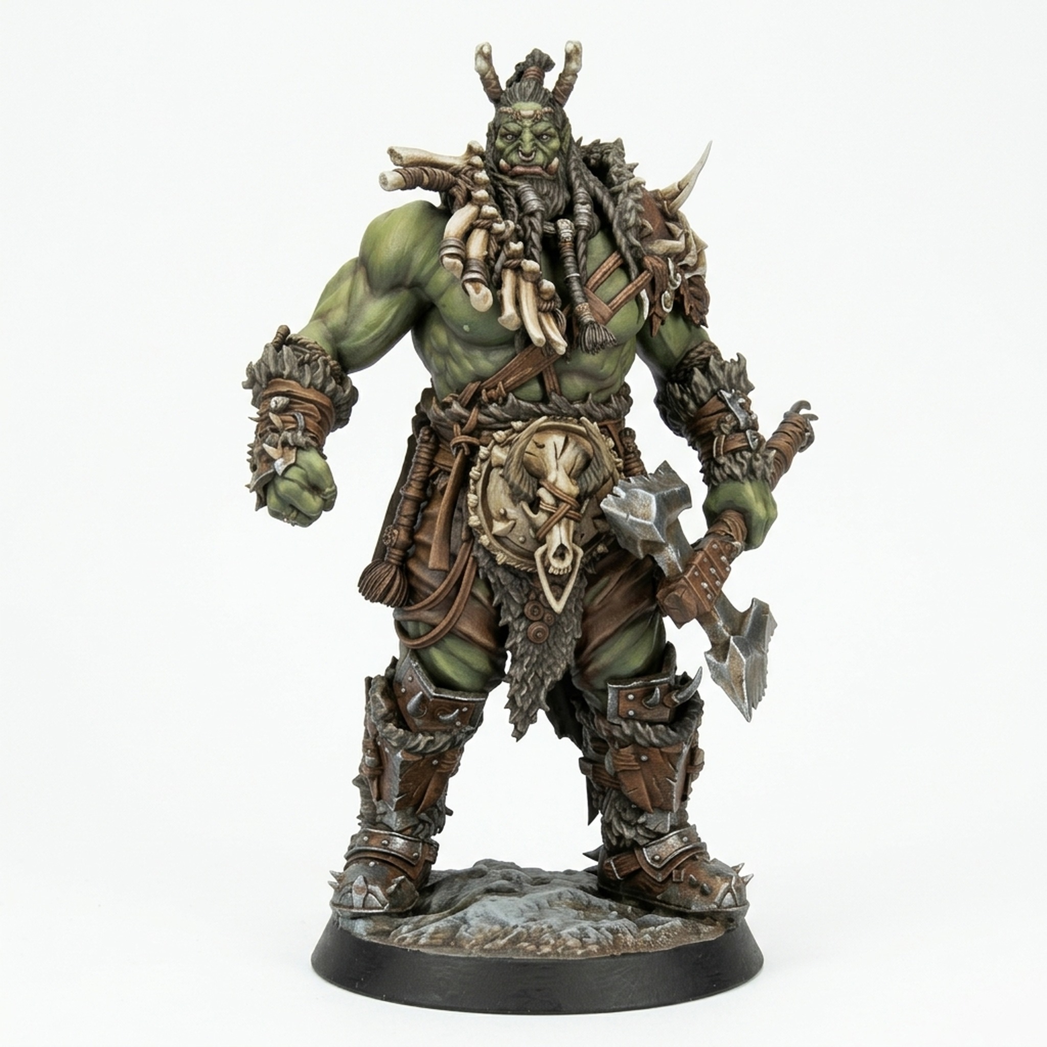 Introduce a powerful presence to your tabletop battlefield with Azhrog Stand from Rescale Miniatures' Northern Orcs collection. This imposing Orc Barbarian miniature embodies strength and ferocity, standing tall and ready for combat. Clad in heavy fur, detailed leather, and crude but effective armor plating, Azhrog clutches a massive, battle-worn hammer, showing every sign of a seasoned warrior. The intricate sculpt captures the raw texture of the fur and the jagged edges of the hammer head, making it a standout piece for any collector or player.