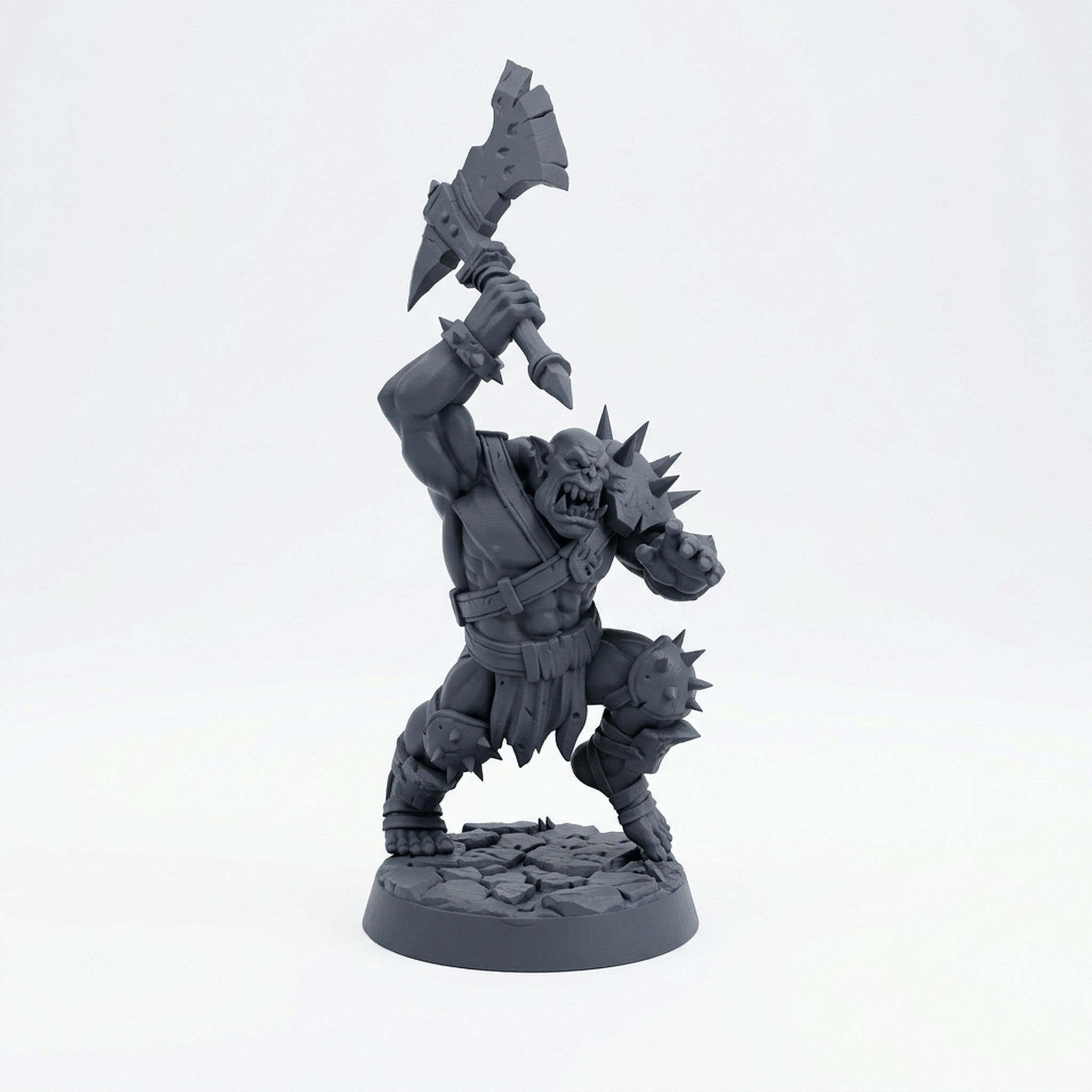 Designed with intricate detail, from the textured skin to the spiked metal plates on his shoulder and leg, this miniature is a painter's dream. Whether you need a savage barbarian for your D&D campaign, a formidable champion for your orc horde in Pathfinder, or a centerpiece model for your tabletop wargaming army, Body Chopper C is the perfect choice. The dynamic pose and battle-worn gear tell a story of countless fights, making this model stand out on any gaming mat or display shelf.