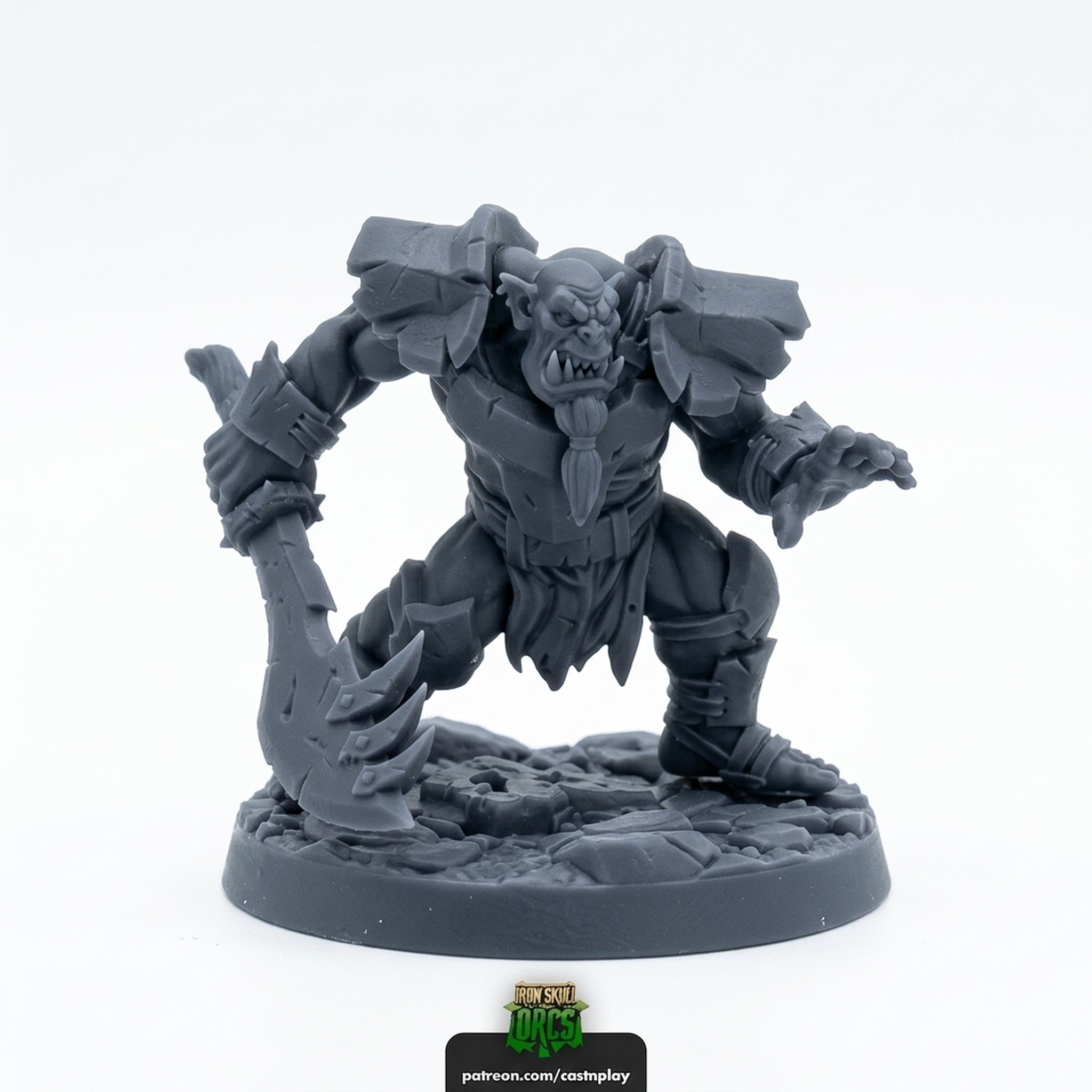 Bring unrelenting fury to your tabletop battles with Body Choppers F, a heavily armored brute from the formidable Iron Skull Orcs collection by CastnPlay. This ferocious warrior is sculpted in a powerful, grounded stance, gripping a massive, battle-worn greataxe and ready to unleash a devastating strike. Wearing chunky, cobbled-together scrap armor and a menacing skull helm, Body Choppers F embodies the chaotic strength of an orcish horde. The level of detail from the rippling muscle definition to the jagged edges of the weapon makes this an excellent centerpiece for an encounter.