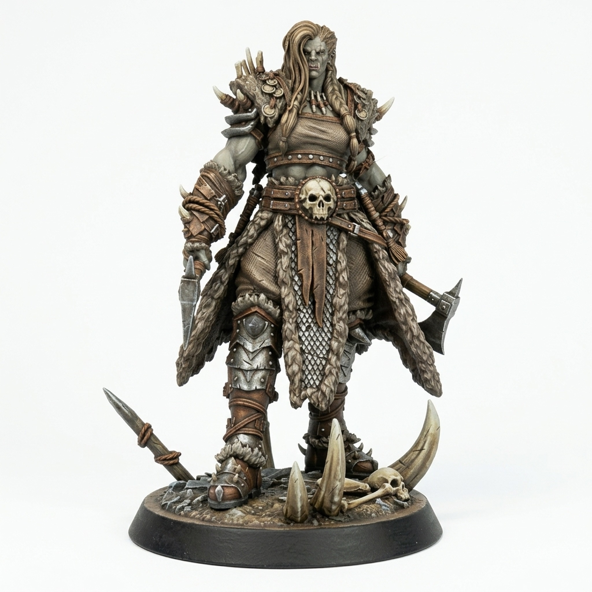 Meet Drakka, a formidable Female Orc Barbarian ready to lead your horde to glory. From the talented team at Rescale Miniatures as part of the Northern Orcs collection, this stunning model captures the raw power and icy resolve of a true warrior of the frozen wastes. Sculpted with incredibly sharp detail, she stands proudly clad in layered furs, detailed leather armor, and forged metal plating. Drakka wields two brutal axes, prepared to carve through any foe. Every aspect of this miniature, from the intricate braiding of her hair to the menacing skull trophy on her belt, is rendered with precision, making it a dream for both painters and gamers alike.