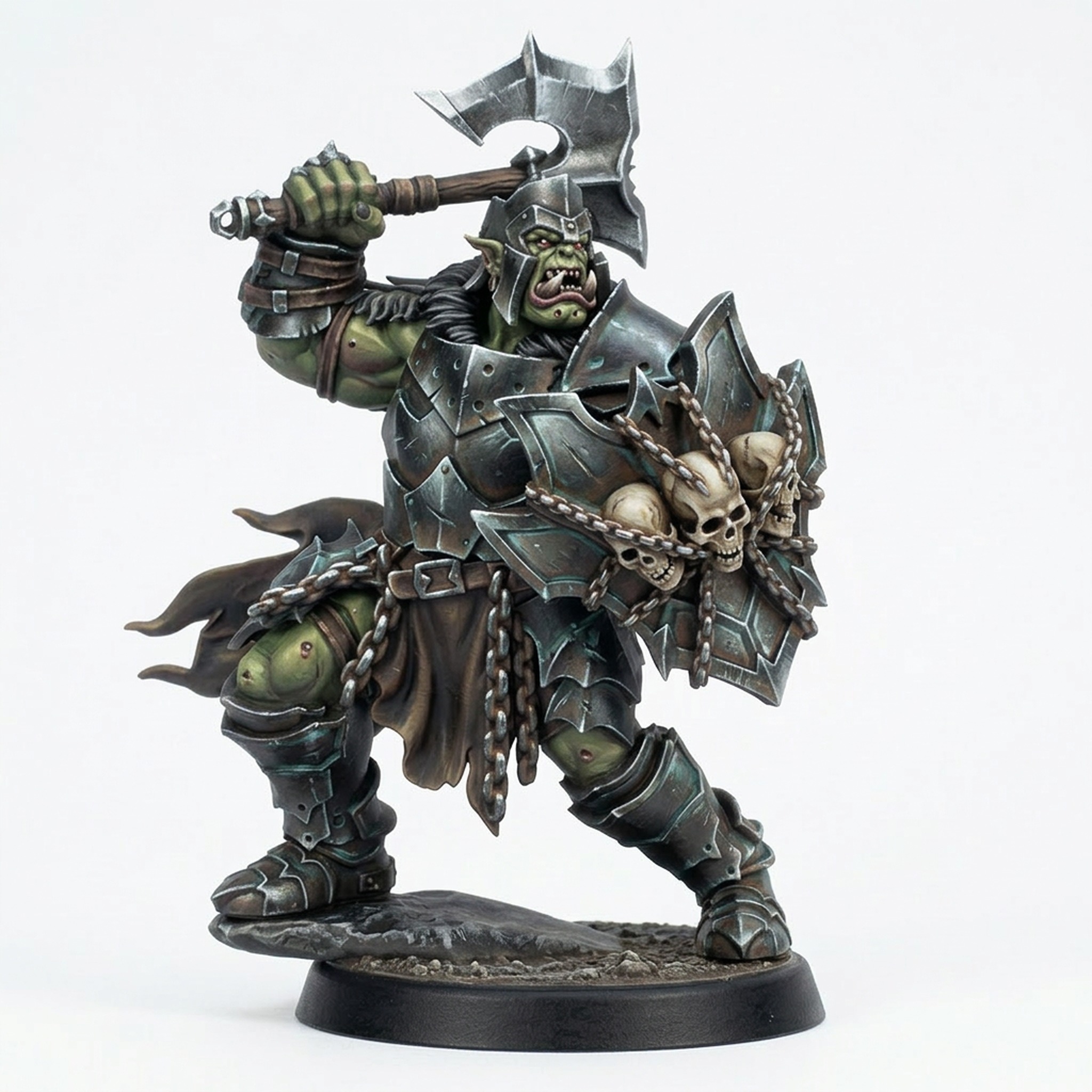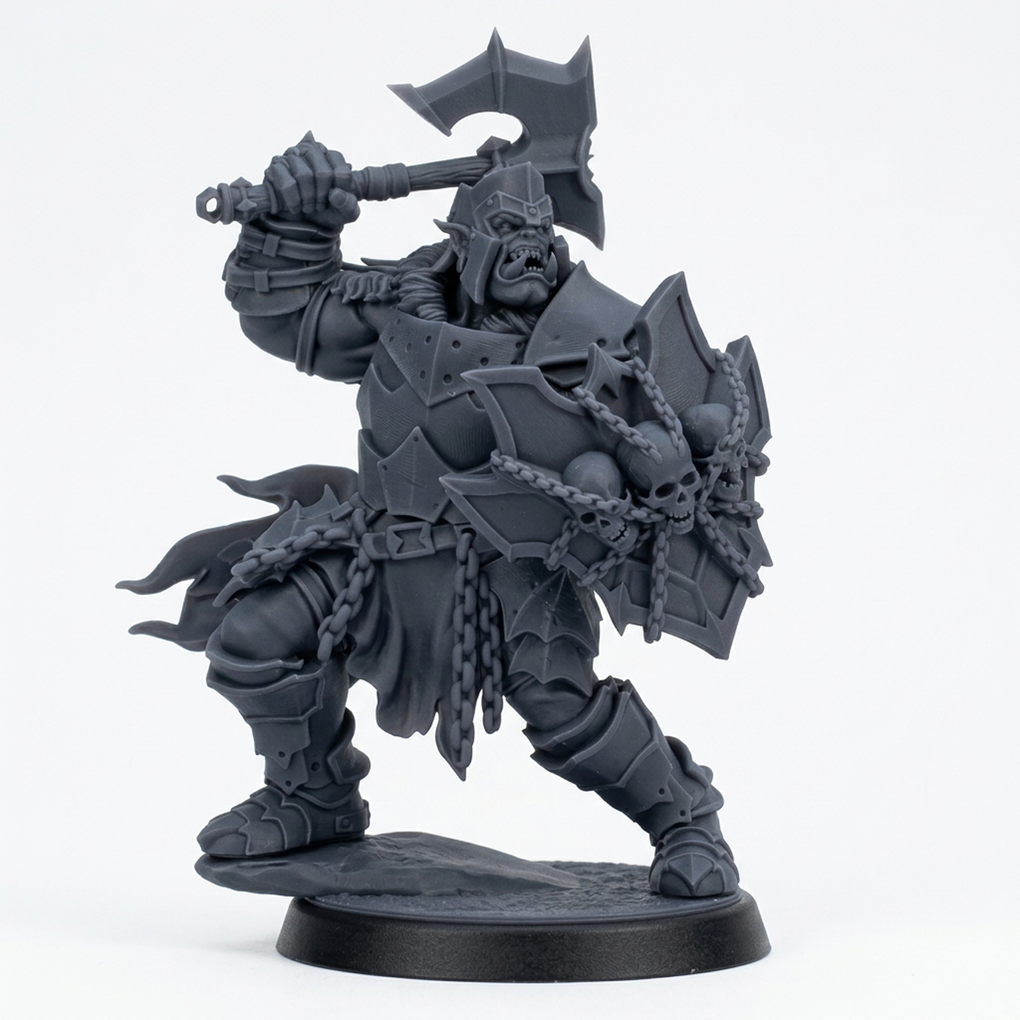 Introduce a new level of savagery to your gaming table with the Ironcrag Orc 1, a premium 3D printed miniature from the legendary 'The Iron Hills' collection by Mammoth Factory. This heavily armored Orc warrior is captured in a dynamic, aggressive pose, raising a massive greataxe and brandishing a shield adorned with chained skulls, ready to crush any foes of the horde. The level of detail in the chainmail, segmented plate armor, weapon battle-wear, and snarling expression makes this a stunning piece for both painters looking for a challenge and players wanting a formidable villain or hero.