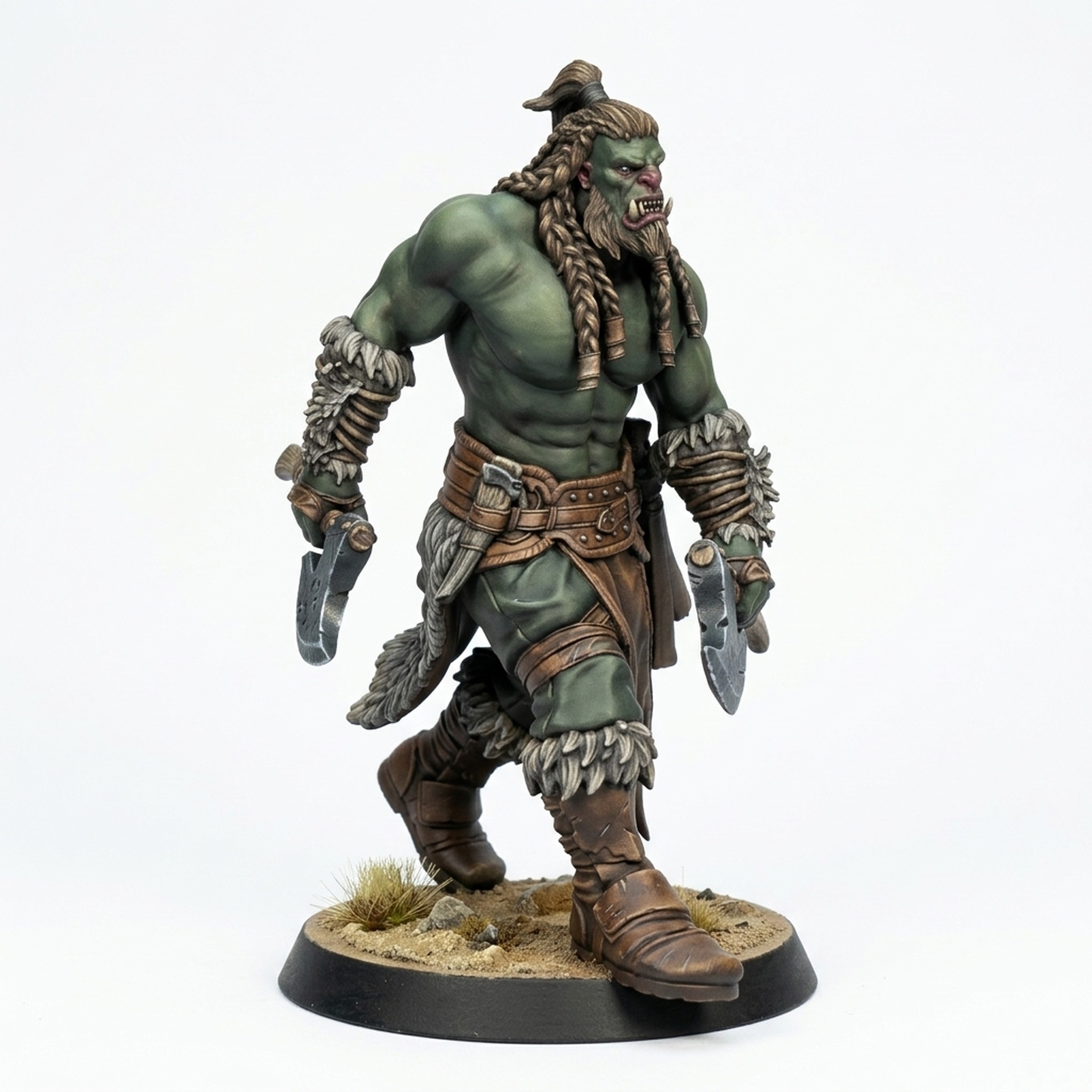 Bring brutal strength to your tabletop with the Orcsoldier Axewalk from Rescale Miniatures' Northern Orcs collection. This imposing miniature captures a muscular orc warrior in mid-stride, gripping a massive axe and ready to crush his foes. Every inch of this model is packed with character, from the intricate braids in his hair and beard to the rugged textures of his fur-lined boots and arm bracers. The dynamic pose and determined expression make this orc an essential addition to any horde.