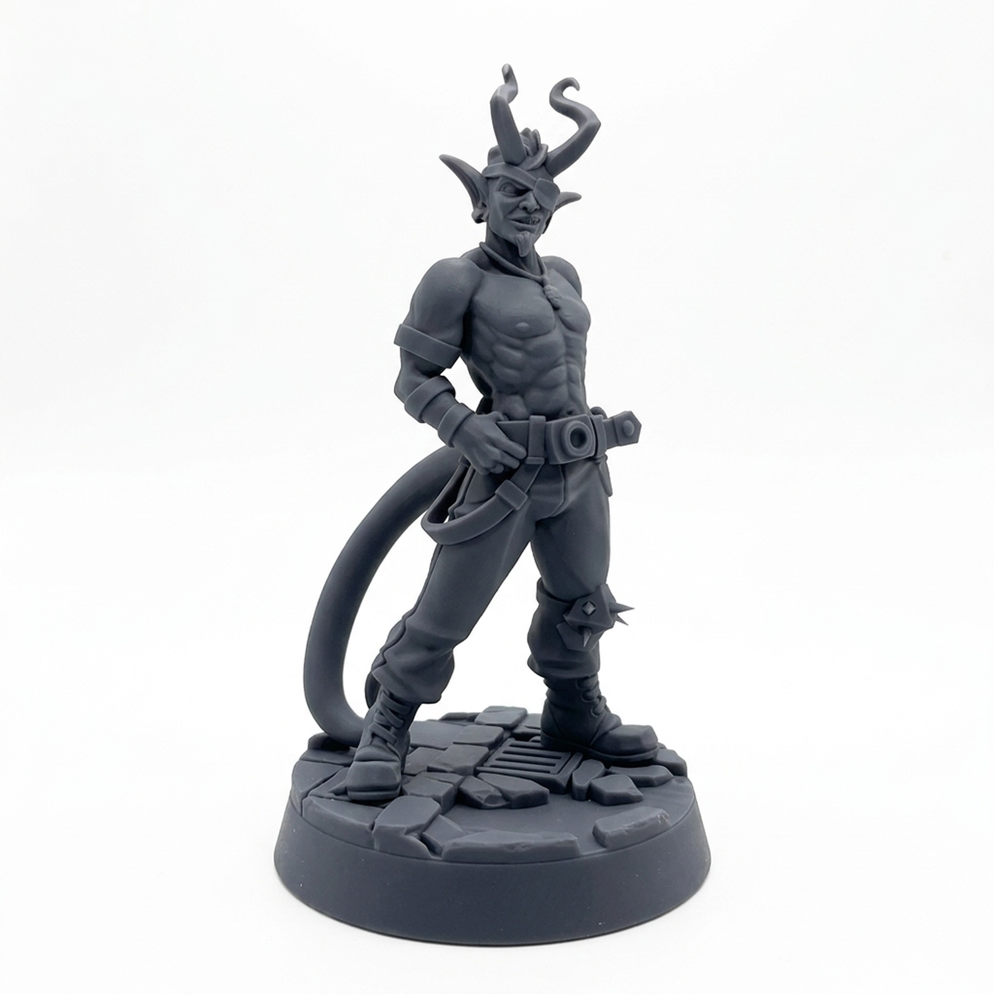 Introduce intrigue and character to your bustling city streets with Kyros, the charismatic smoking Tiefling from CastnPlay's Townsfolk Vol 2 collection. Sculpted with impressive detail, this miniature captures Kyros mid-draw, leaning back with a cool, confident air. He features the classic tiefling traits of curved horns and a long tail, all rendered with sharp clarity. His musculature, layered attire, and the simple cobblestone texture on his base show the high sculpt quality CastnPlay is known for.