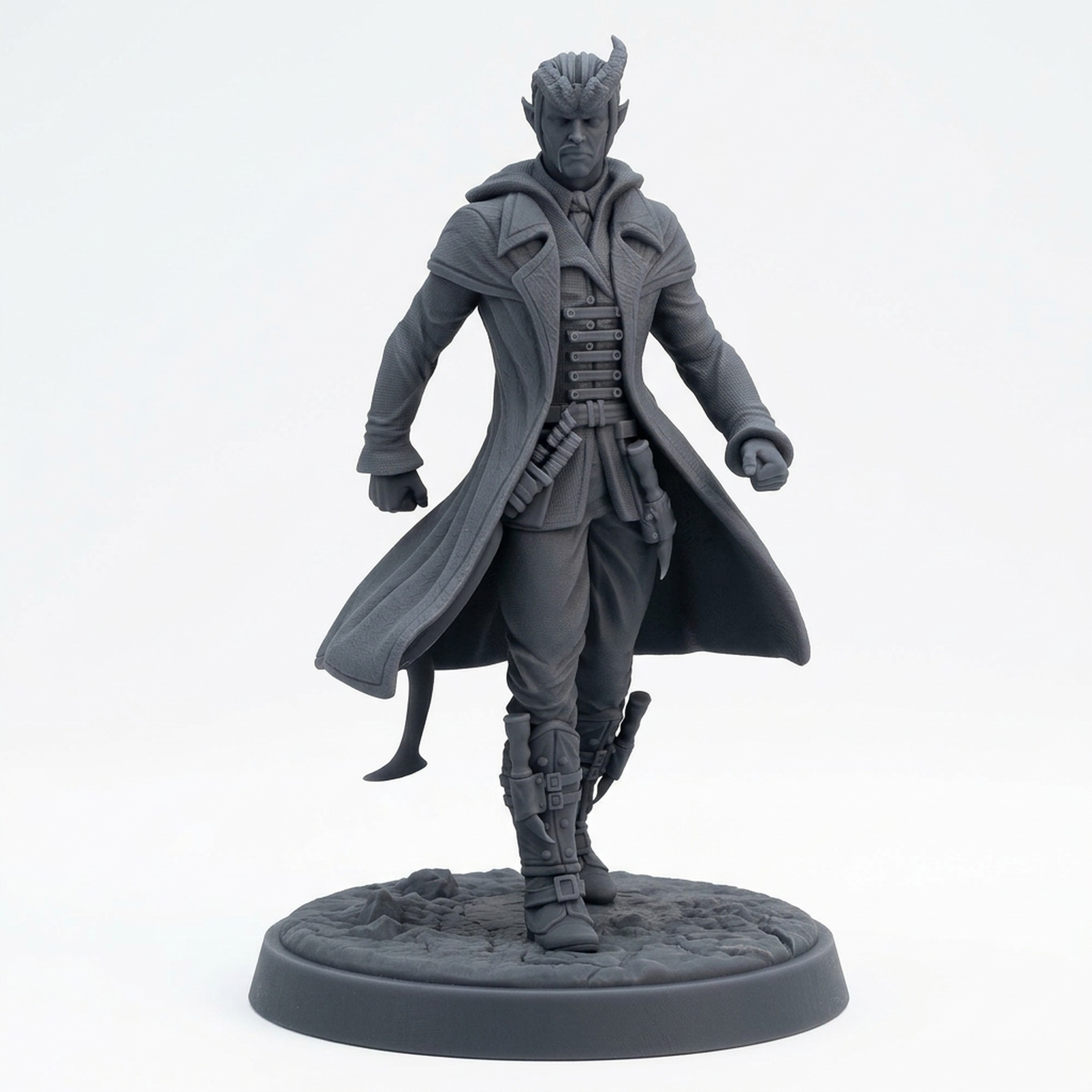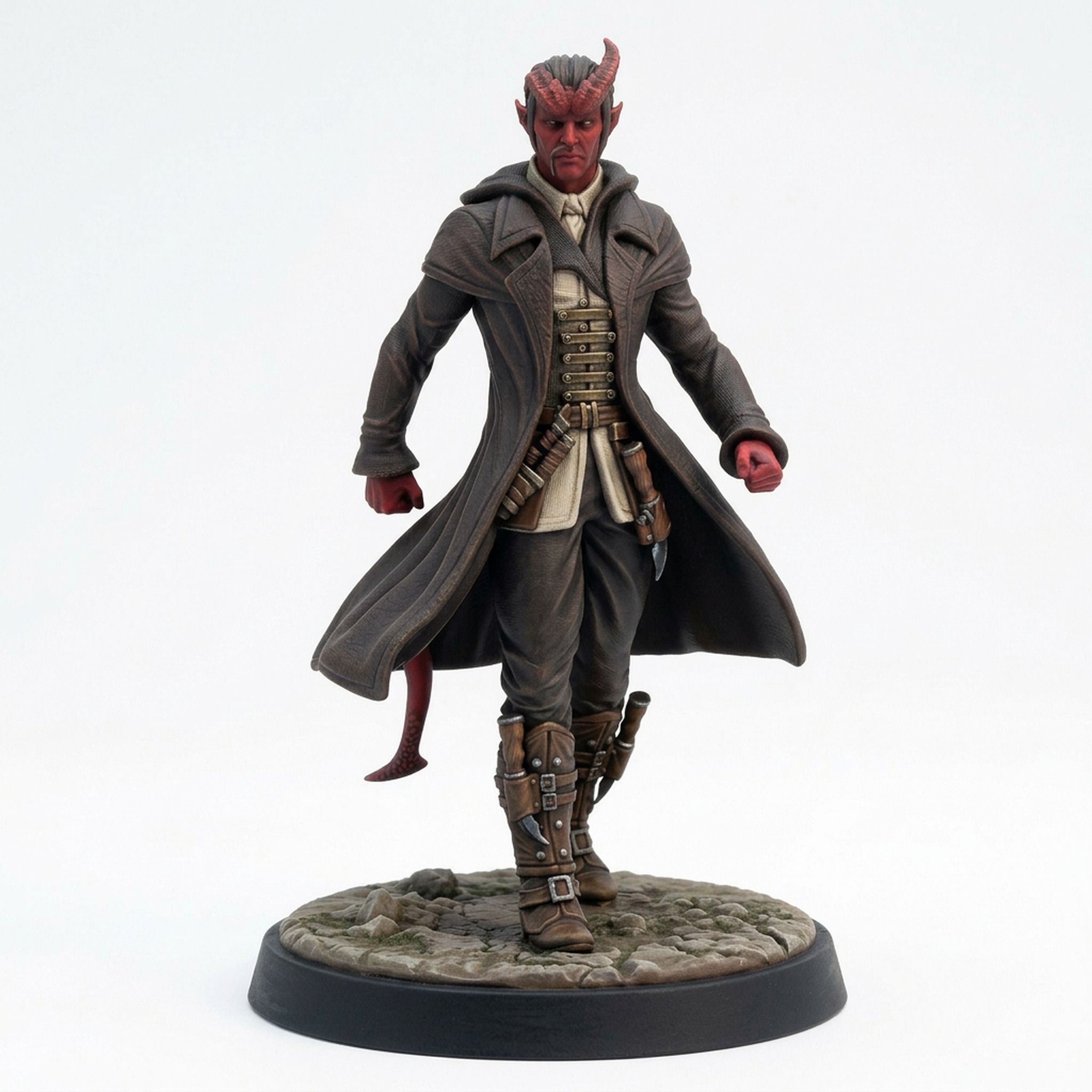 Introduce intrigue and shadow to your next tabletop campaign with Syrus, a cunning Tiefling rogue miniature sculpted by the talented team at Mammoth Factory for the Saurian Isles collection. This highly-detailed figure perfectly captures the enigmatic presence of a resourceful underworld contact or a deadly assassin for hire. Syrus stands dynamically posed, clad in a sweeping longcoat that flows with his stride, hinting at layers of hidden gear and daggers strapped to his belts and boots. His features are distinct, with prominent horns, pointed ears, a knowing smirk, and a segmented tail, making him a unique and memorable addition to any adventure. Whether you’re a player looking for a striking new character or a Dungeon Master seeking a compelling NPC, Syrus offers exceptional detail and character that will stand out on any gaming mat.