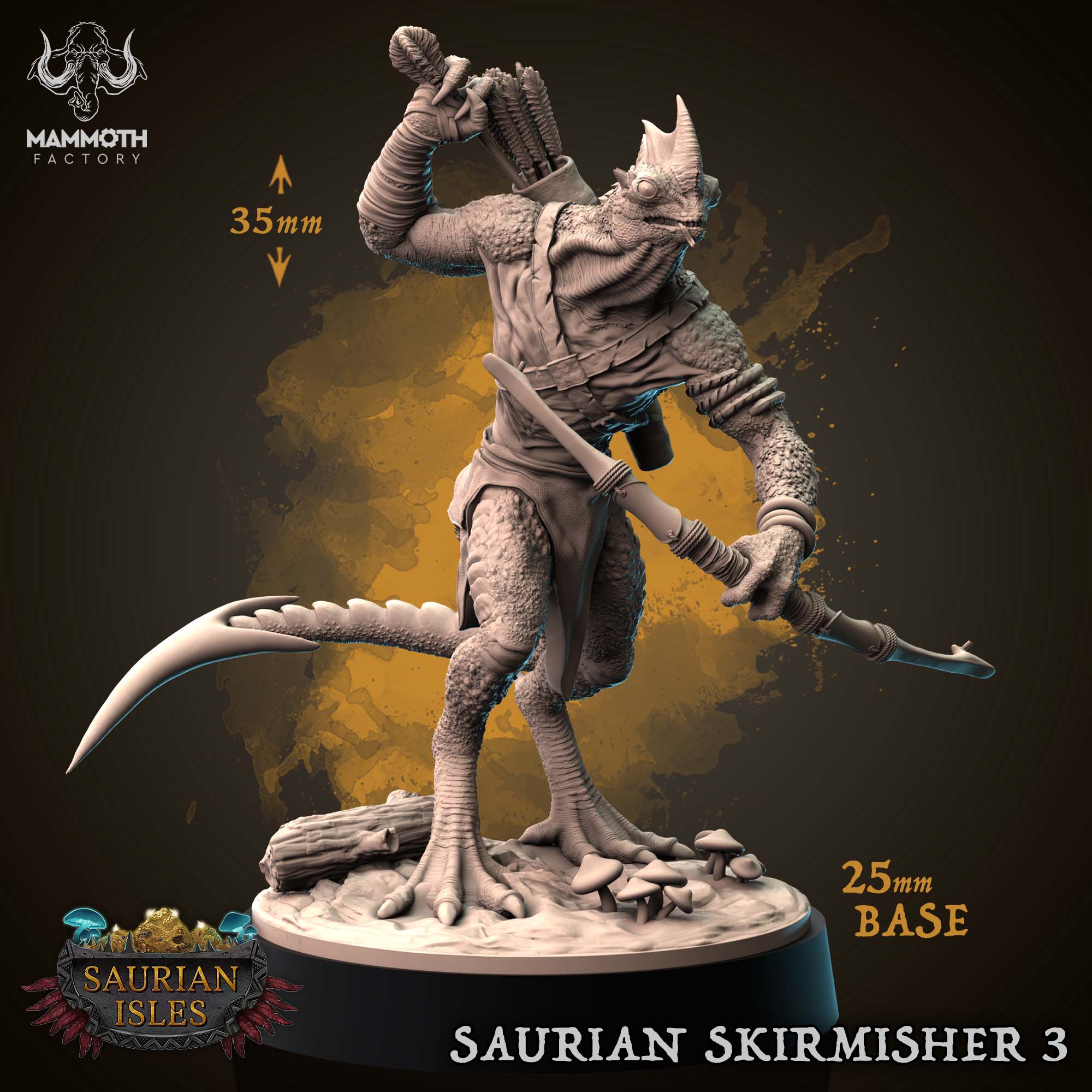 Introduce a swift and deadly scout to your tabletop games with the Saurian Skirmisher 3. This finely sculpted lizardfolk archer from Mammoth Factory’s ‘Saurian Isles’ collection captures a moment of dynamic action. In a prowling pose across jungle terrain, this reptilian warrior is reaching for a fresh arrow, its attention fixed on distant prey. The detailed musculature, reptilian skin textures, and practical gear like the quiver, loincloth, and bracers make this miniature a standout addition to any lizardfolk warband or party.