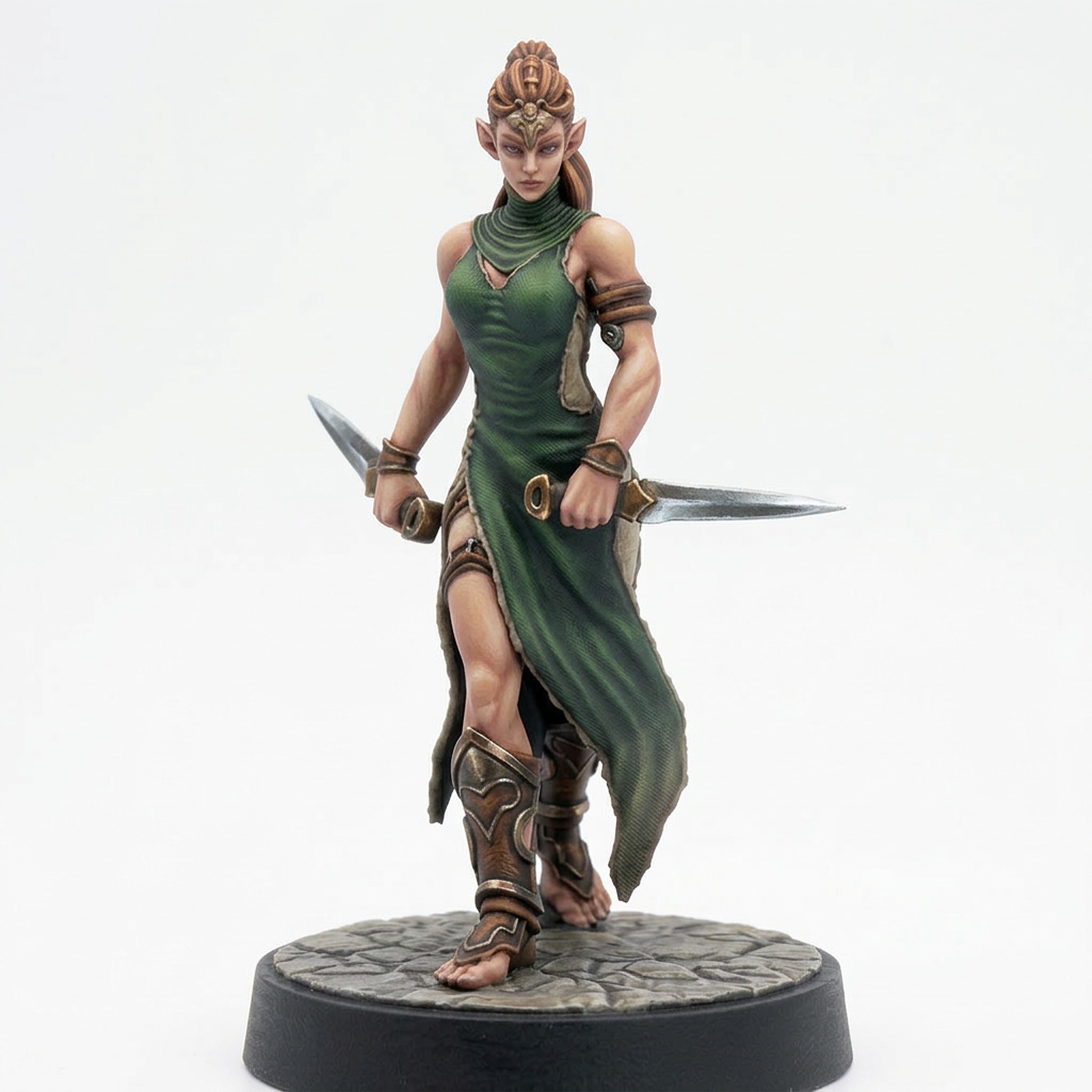 Prepare to face a deadly new adversary from the *Coils of Dread* collection by Mammoth Factory. The **Ssrall Hybrid 1** is a breathtaking fusion of serpentine grace and humanoid form. Standing 38mm tall and armed with dual wicked daggers, this female rogue is ready to strike from the shadows in your next TTRPG session. The sculpt is filled with intricate details, from the textured snakeskin pattern on her tunic to the coiled armband and the distinct, pointed features of her hybrid face. The motion in her tattered skirt and confident stride gives her an dynamic presence on the table.