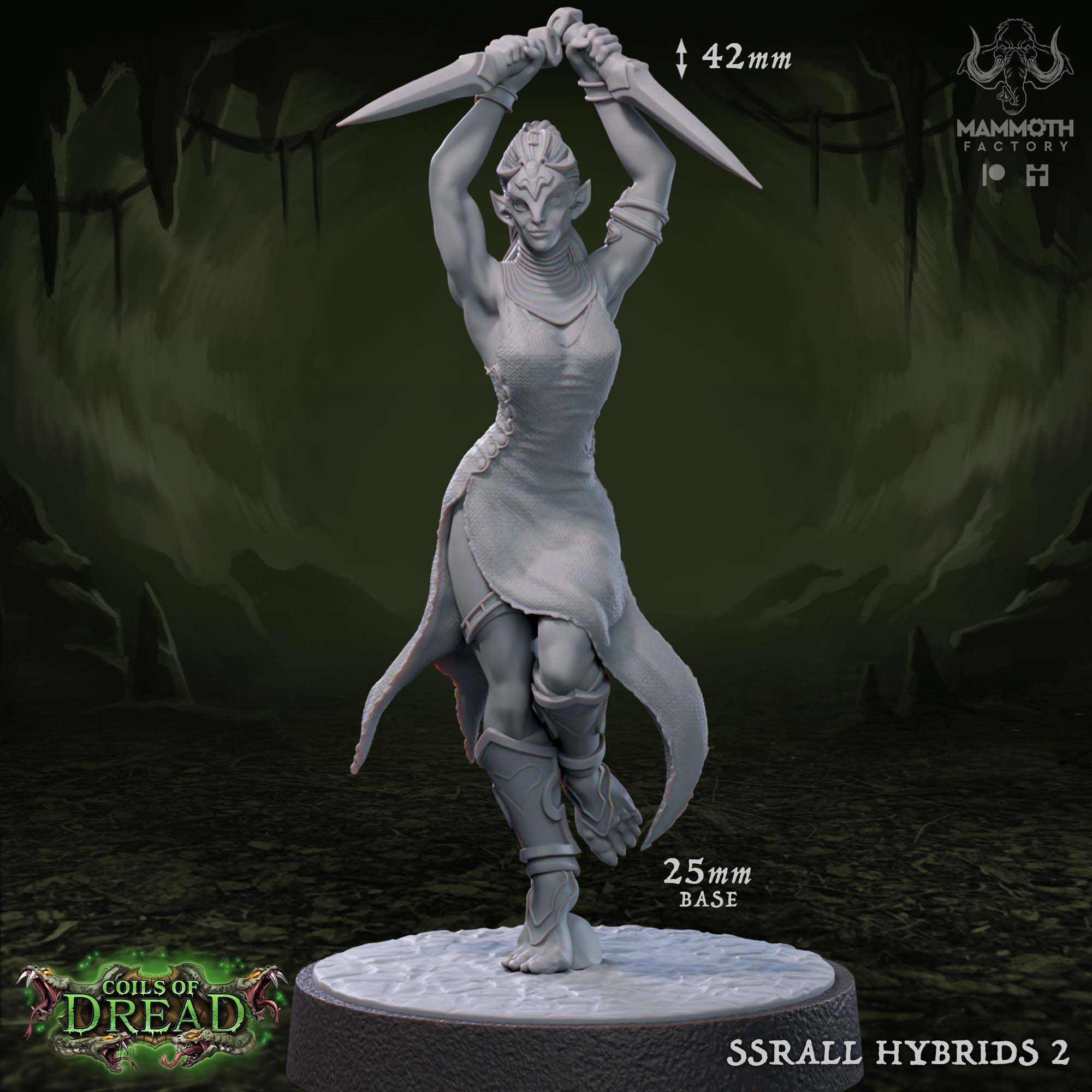 Introduce a new level of danger to your tabletop games with the Ssrall Hybrid 2 from Mammoth Factory’s acclaimed Coils of Dread collection. This stunningly sculpted miniature captures a serpentine-humanoid hybrid in a deadly, dynamic pose. Poised and ready to strike with dual daggers, this female Ssrall is perfect for representing a cunning rogue, assassin, or cultist in your Dungeons & Dragons, Pathfinder, or other fantasy RPG campaigns. The intricate details, from the scaled skin textures to the flowing garment and weapon designs, make this a dream for miniature painters looking to test their skills.