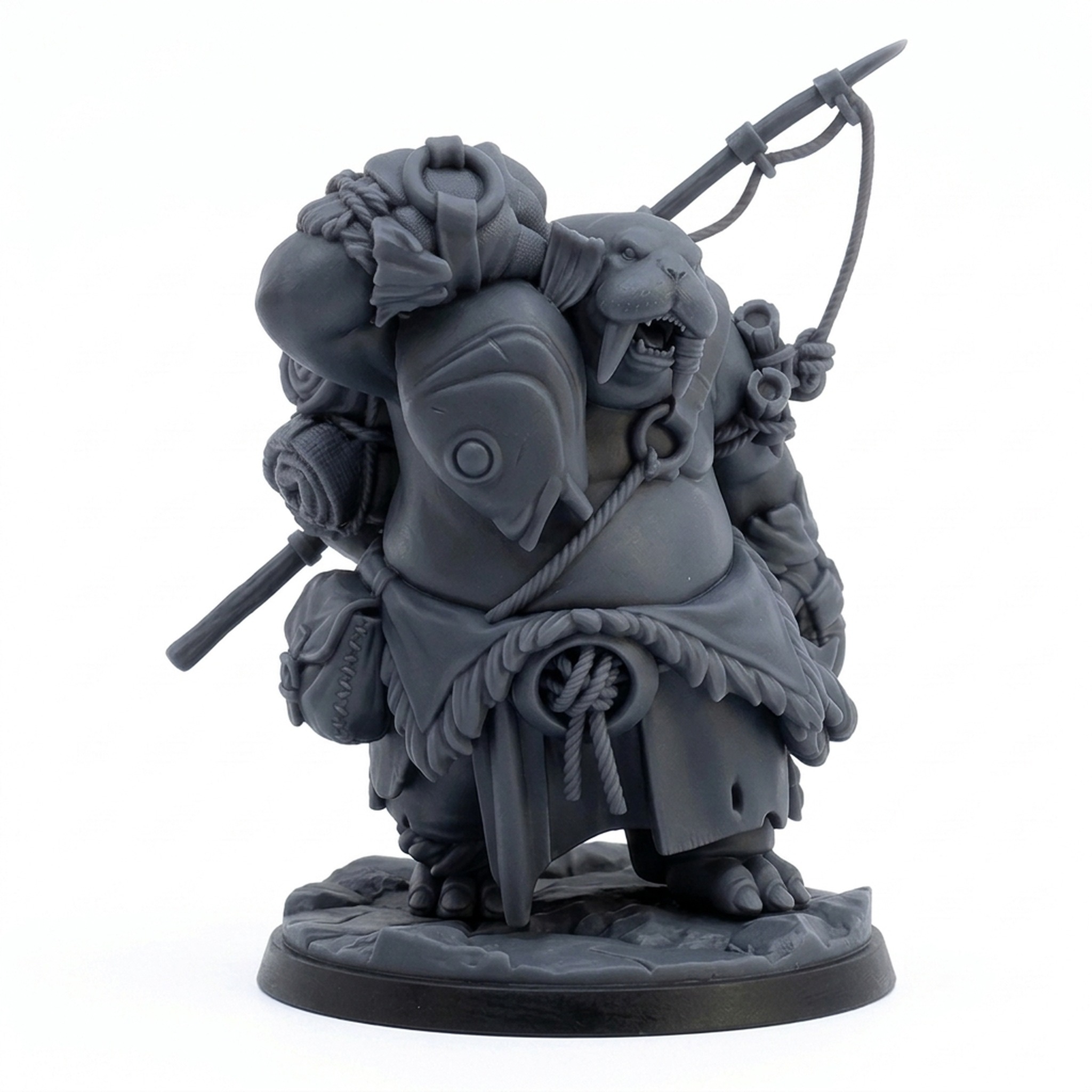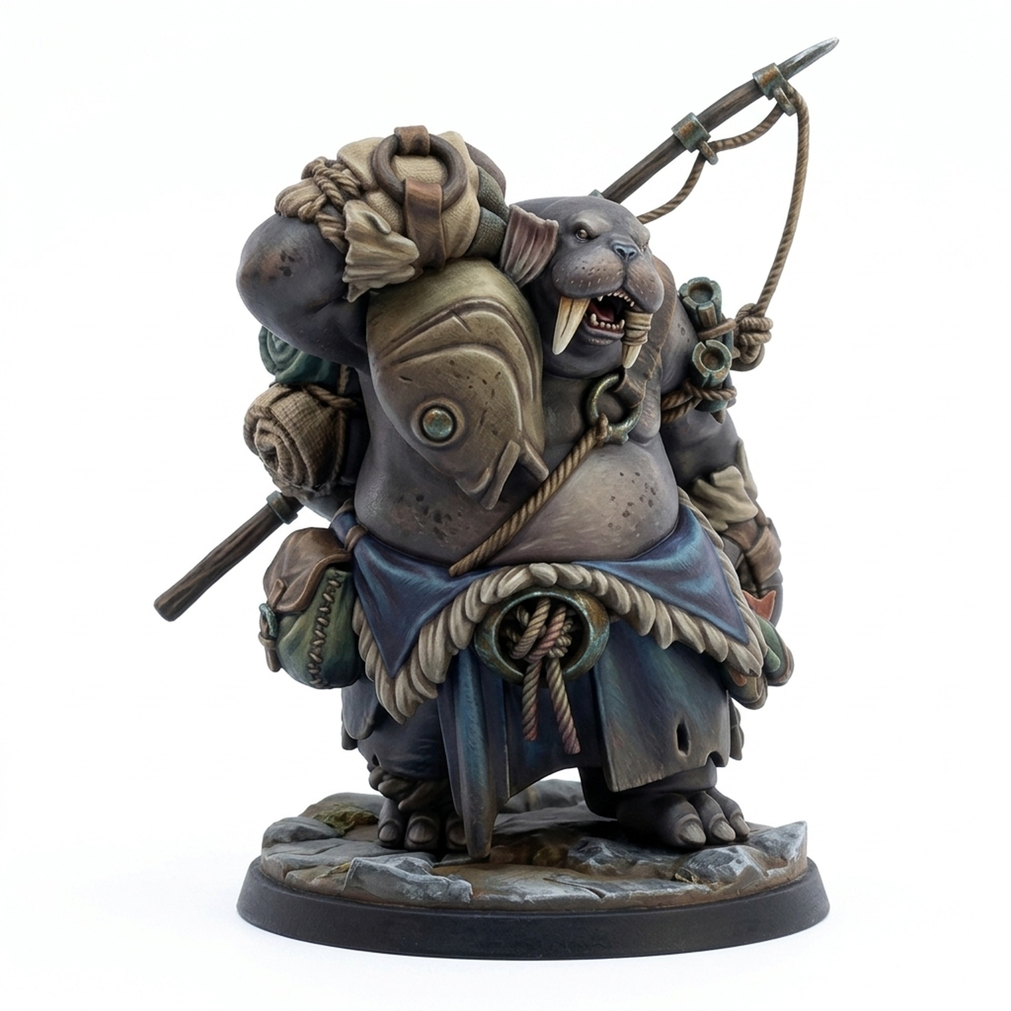 Add a touch of icy realism and character to your next tabletop RPG adventure with the Walrus Fisher miniature from CastnPlay's acclaim collection, "The Icebound." This high-quality resin print captures the stout, determined nature of this anthropomorphic marine hunter. Clad in thick, fur-trimmed tunics and armed with a realistic fishing spear and harpoon, the intricate sculpt highlights every feature from the thick tusks and grizzled mustache to the woven ropes and pouches of their survival gear.