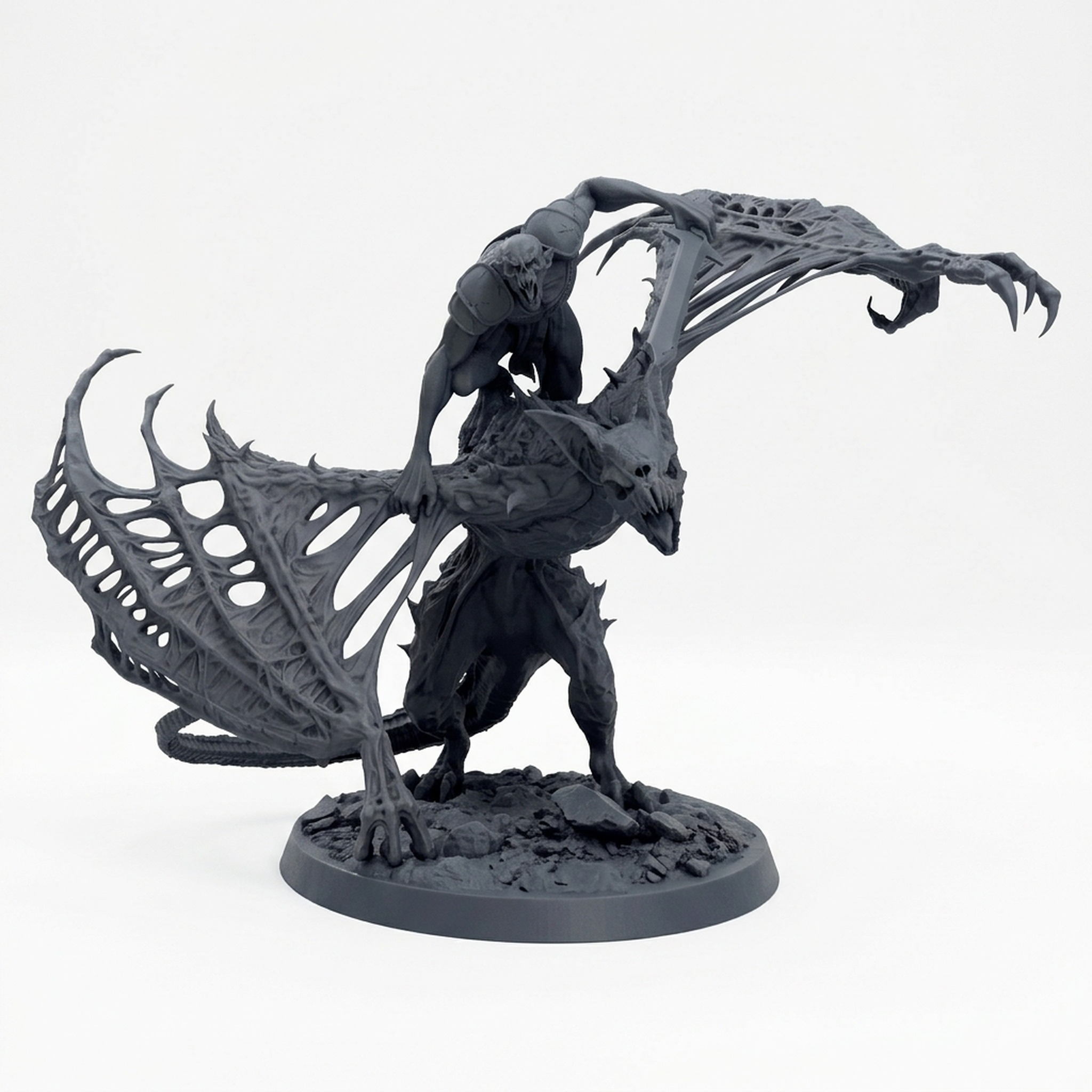A terrifying fusion of beast and master, the Dabeath Attack Mount from the Broken Blood collection by Rescale Miniatures is a breathtaking centerpiece for any tabletop encounter. This complex sculpt features a feral vampire warrior furiously leaping onto the back of a monstrous, bat-like creature. The sense of raw kinetic energy is palpable, from the sprawling, tattered wings of the mount to the predatory snarl of the rider. Every inch of this resin miniature is packed with incredible detail, showcasing textures of leathery skin, ragged membranes, and jagged bone.