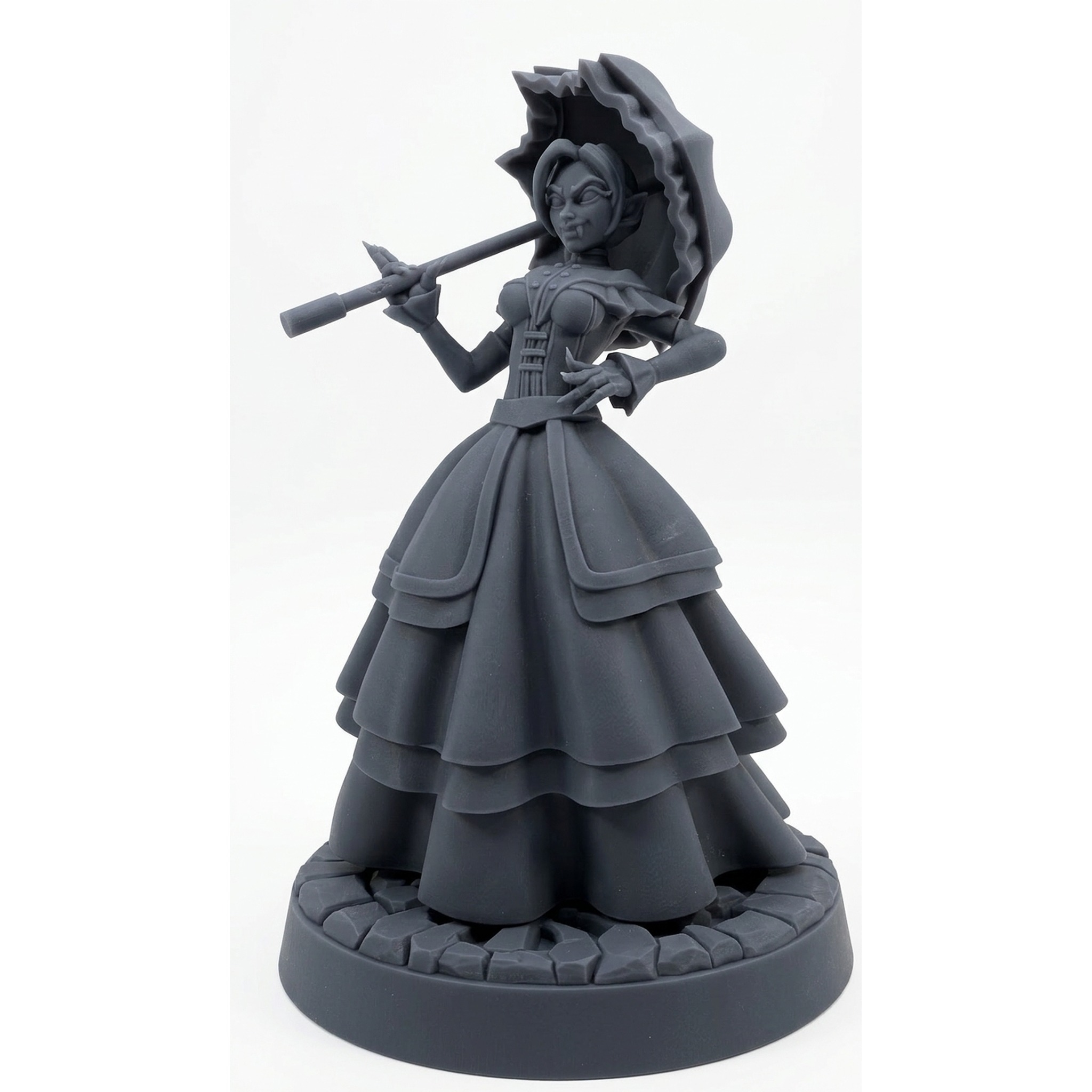 Introduce an unmatched air of dark elegance to your next tabletop session with Esmeraytamisra Bloodlinekeeper, a spectacular female vampire miniature from the acclaimed 'Vampires' collection by CastnPlay. This sculpt masterfully captures the dual nature of a high-ranking vampire countess. One pose shows her in composed sophistication, delicately holding a parasol, while the alternate 'Bloodcrazed' pose reveals her true, monstrous nature. Her flowing, layered dress and intricate details make her an absolute joy for miniature painters and a fearsome centerpiece for D&D players.