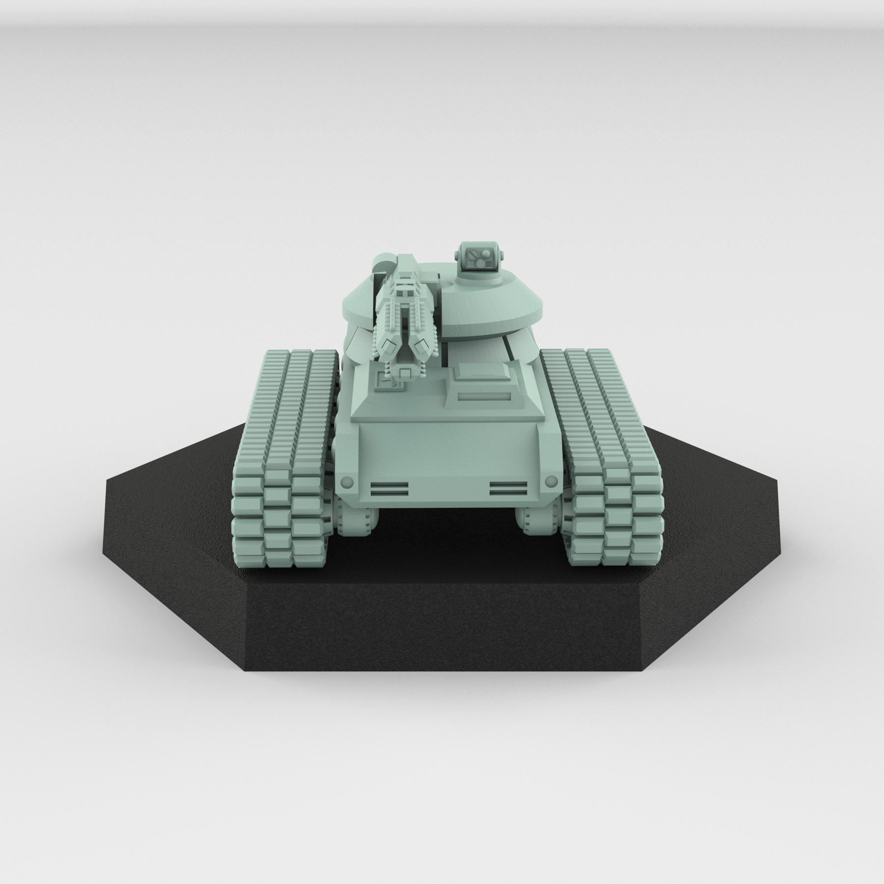 Bring a formidable presence to your tabletop battles with the A.I. Defense Tank, a meticulously detailed 3D printable miniature designed by USe Mechs. This sleek and powerful-looking armored vehicle features a distinctive multi-barrel weapon system mounted on a rotating turret, ready to unleash a barrage of fire upon its enemies. The intricate design details, from the individual track links to the sensor arrays, ensure a high-quality model that looks stunning when painted.