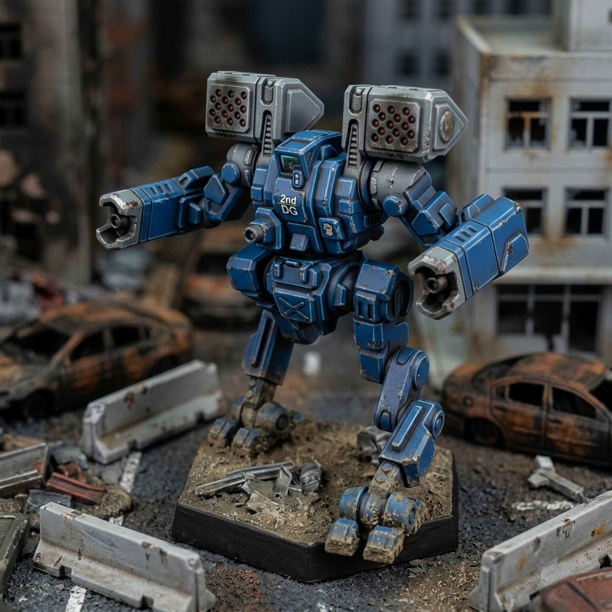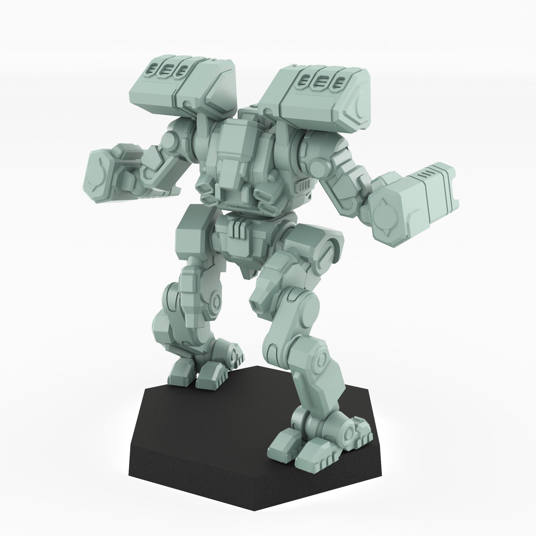 Armed with massive shoulder-mounted LRM pods and dual arm-mounted energy weapons, this design is built to deliver devastating long-range barrages followed by close-in finishing blows. The pose is dynamic, making it a standout commander or assault unit. Whether your preference is a specific scale or custom size, we offer multiple scaling options to ensure it integrates seamlessly into your existing collection or stands alone as a centerpiece model. It comes supplied with a standard hex base.