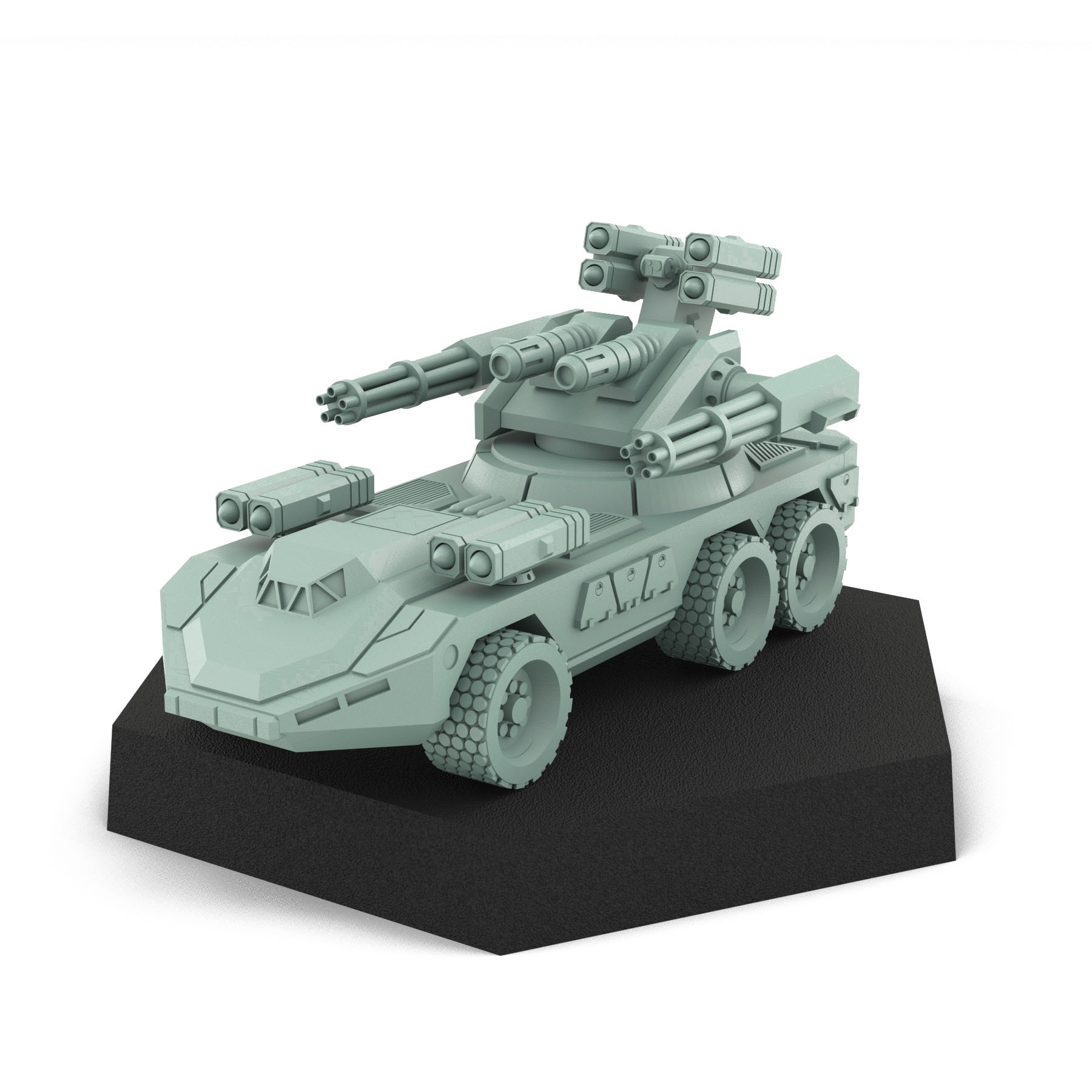 Bring heavy support to your tabletop wargames with the incredibly detailed Typhoon Combat Vehicle miniature. Designed by USe Mechs, this multi-wheeled fighting machine is ready to dominate any futuristic battlefield. Its intimidating design features prominent, multi-barreled gattling cannons and missile pods, all rendered with crisp lines and intricate panel detailing, perfect for showing off your painting skills.